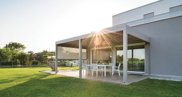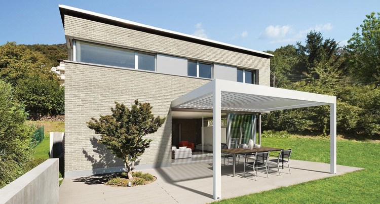 Le produit Pergola avec toit à lames : Pergola Joy du fabricant TERRASSEN VAN HOOF classé dans la catégorie Menuiseries extérieures > Vérandas - bow windows - marquises - pergola > Auvents - marquises - pergola est référencé dans la Matériauthèque digitale Materiaux.archi.