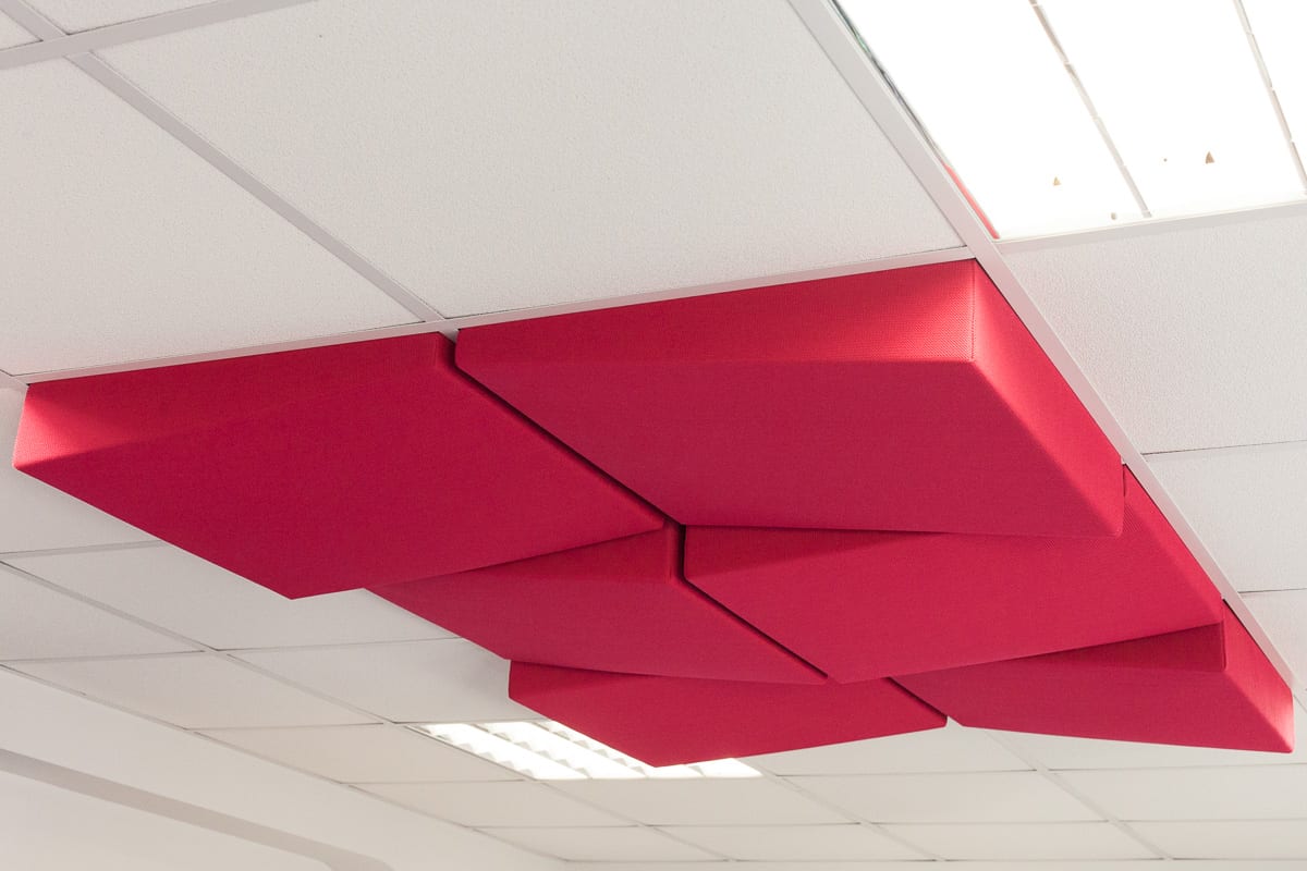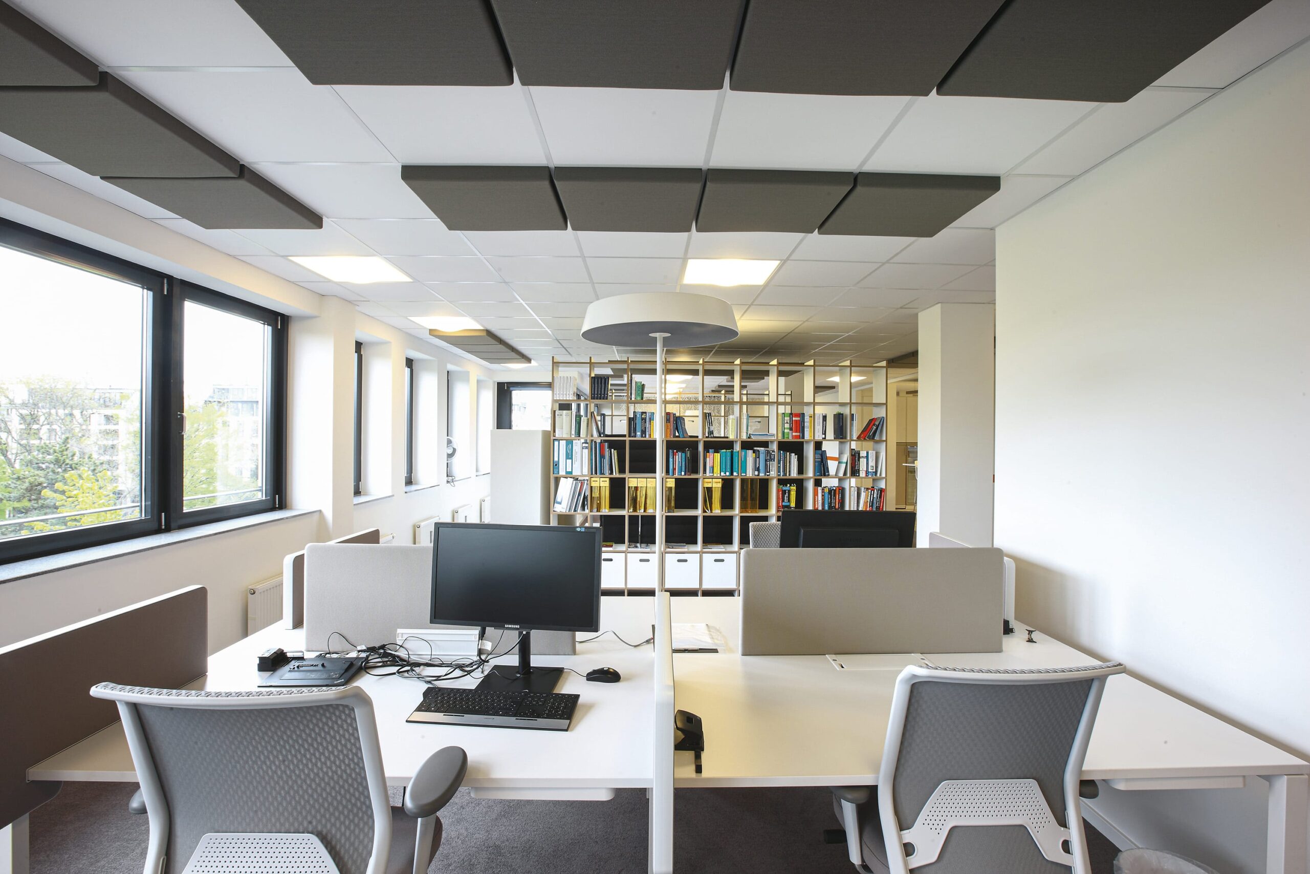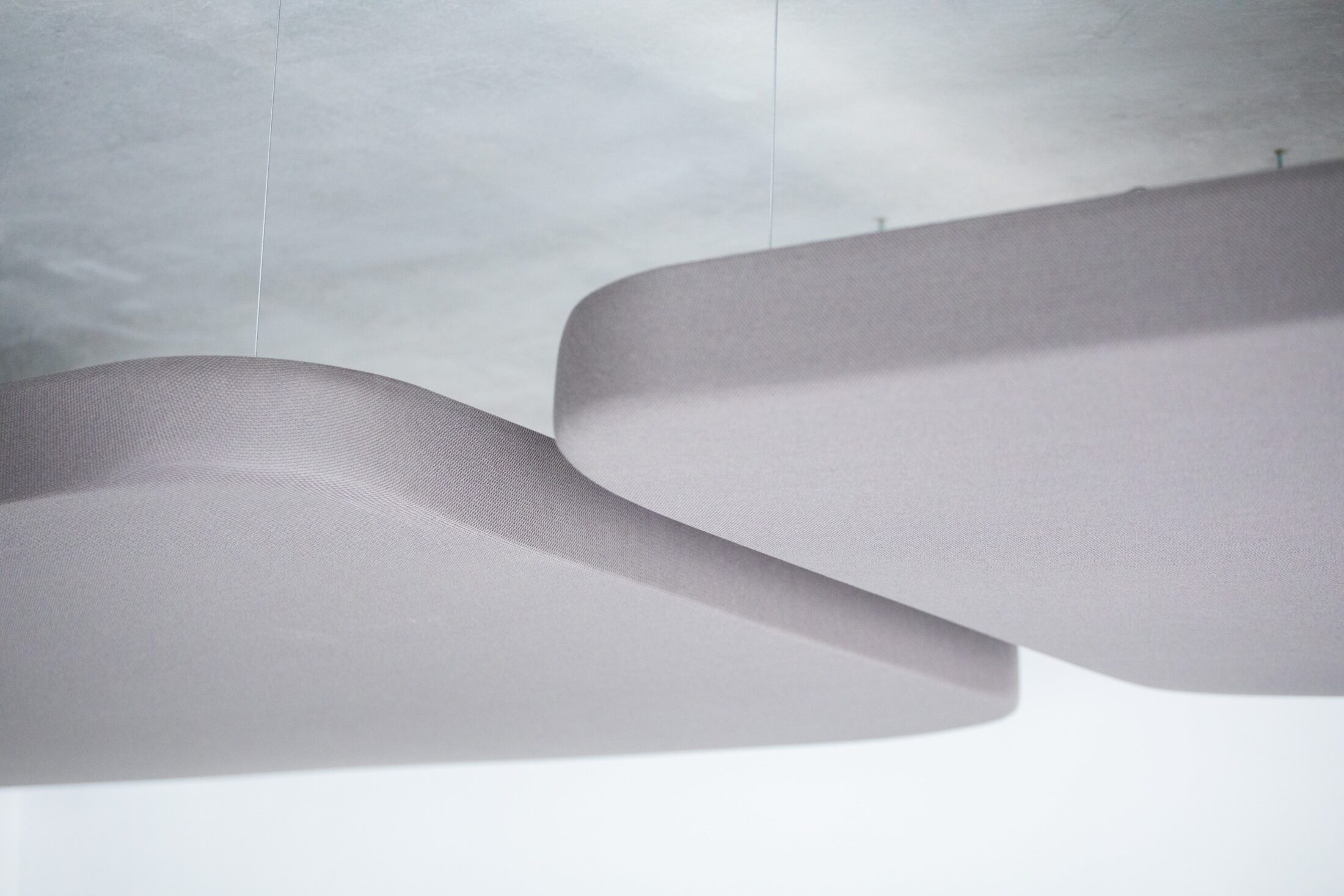 Spécialement conçus pour les faux-plafonds suspendus à ossature en T, les pavés Abso sont glissés à l’intérieur de l’armature pour créer des zones de calme, par exemple au-dessus des postes de travail.