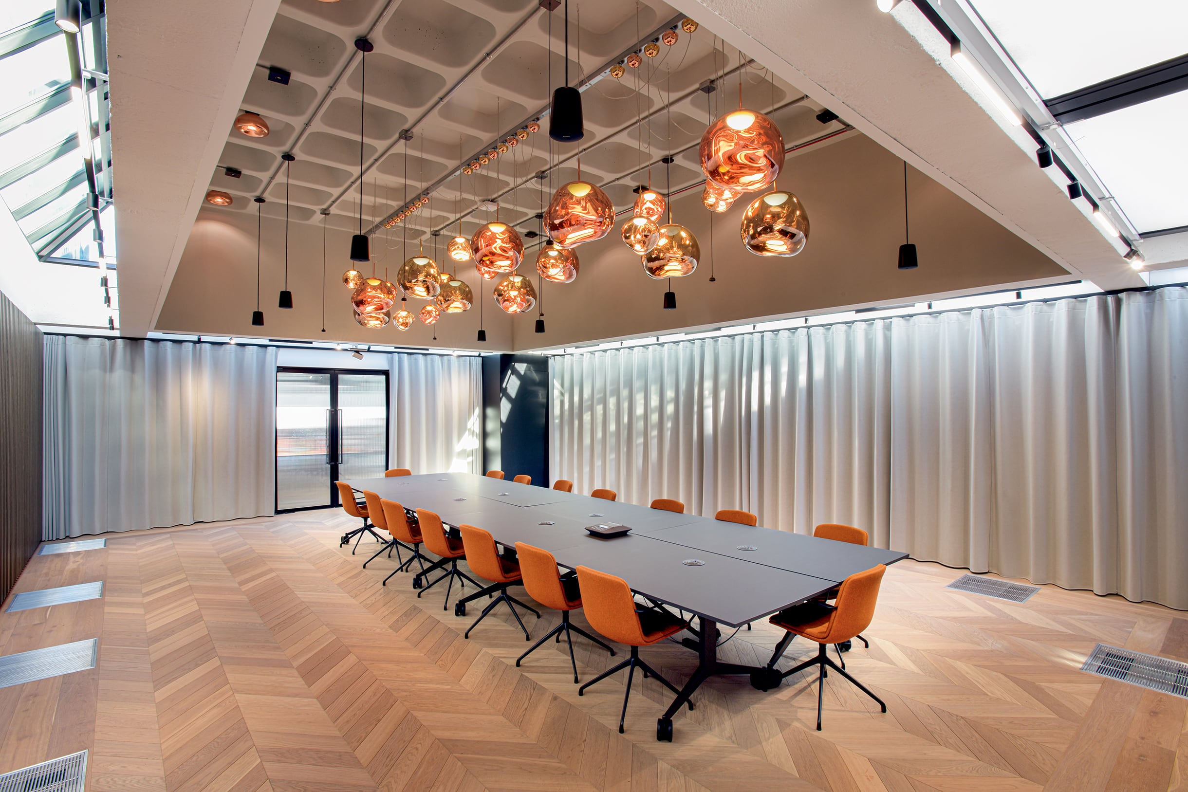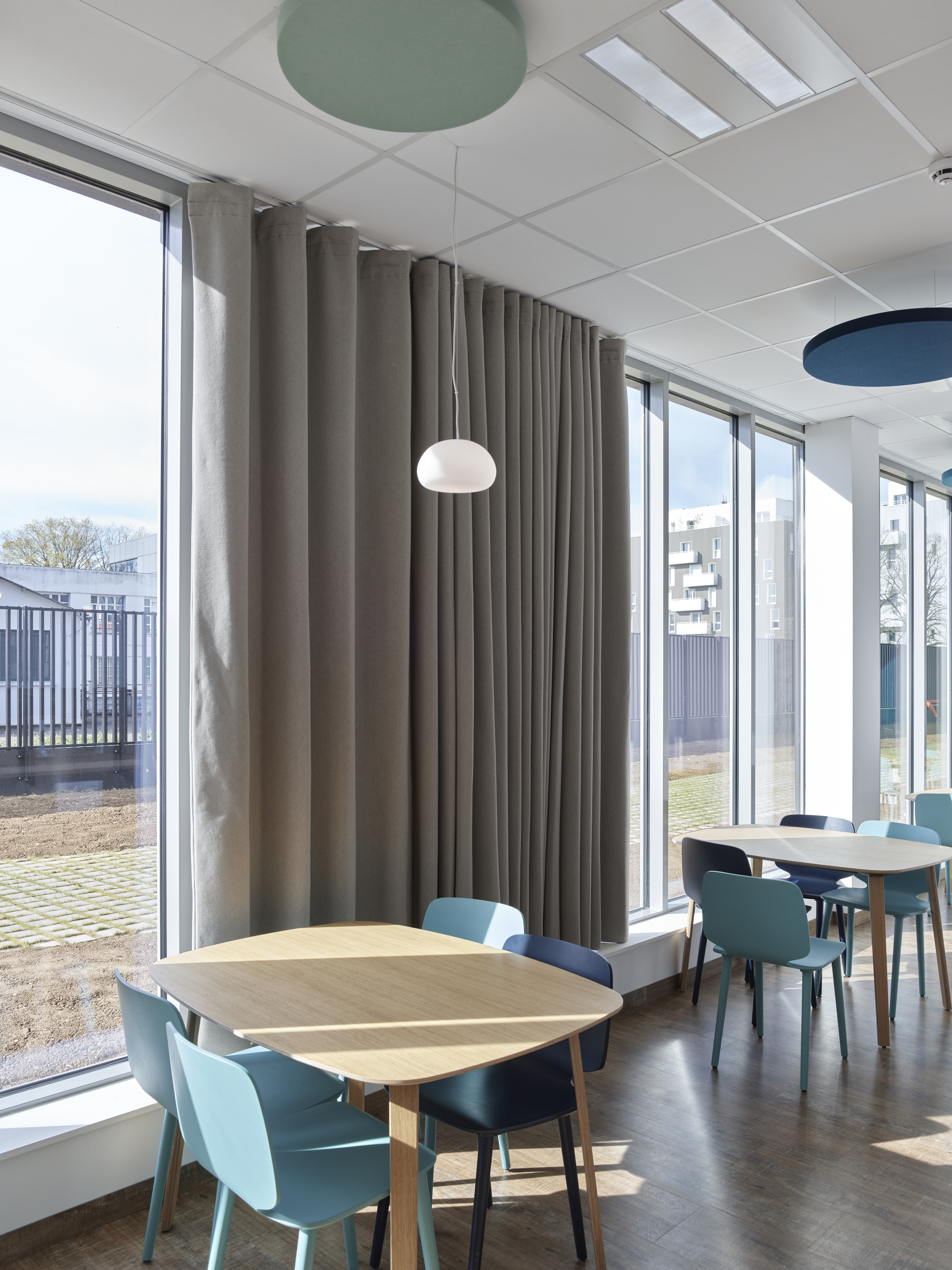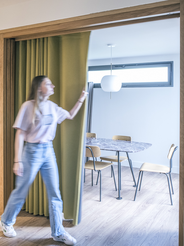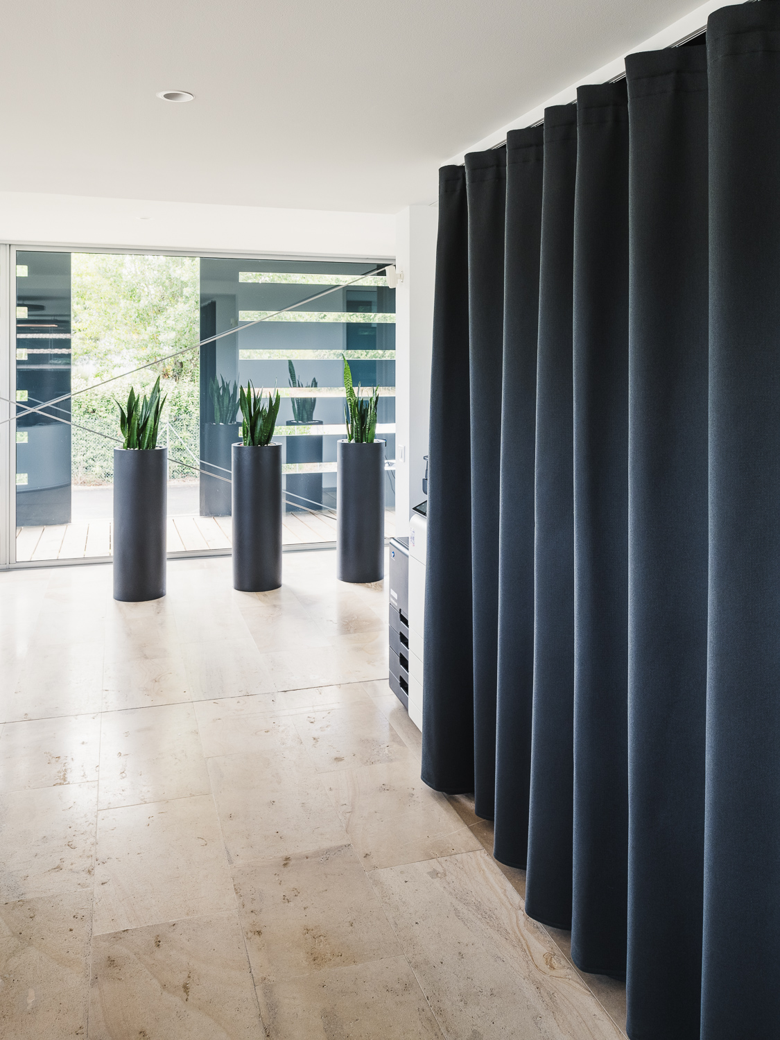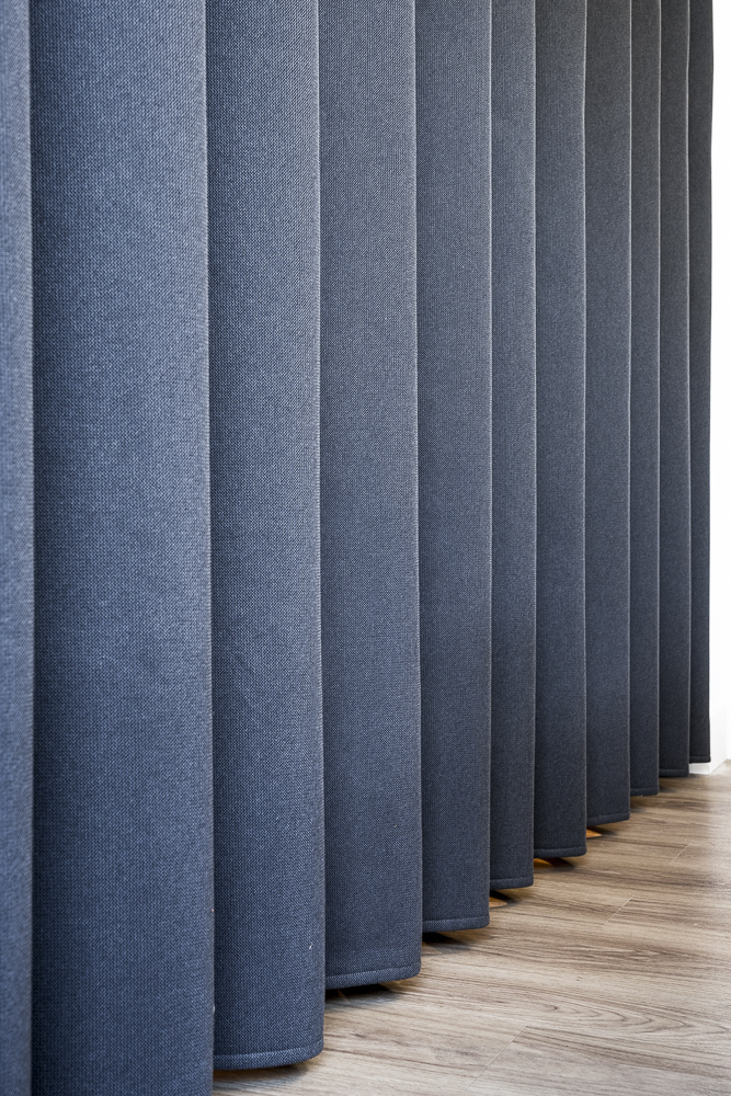 Les rideaux acoustiques absorbants Alpha, positionnés dans le volume ou devant un vitrage, permettent de moduler l’ambiance sonore et lumineuse.