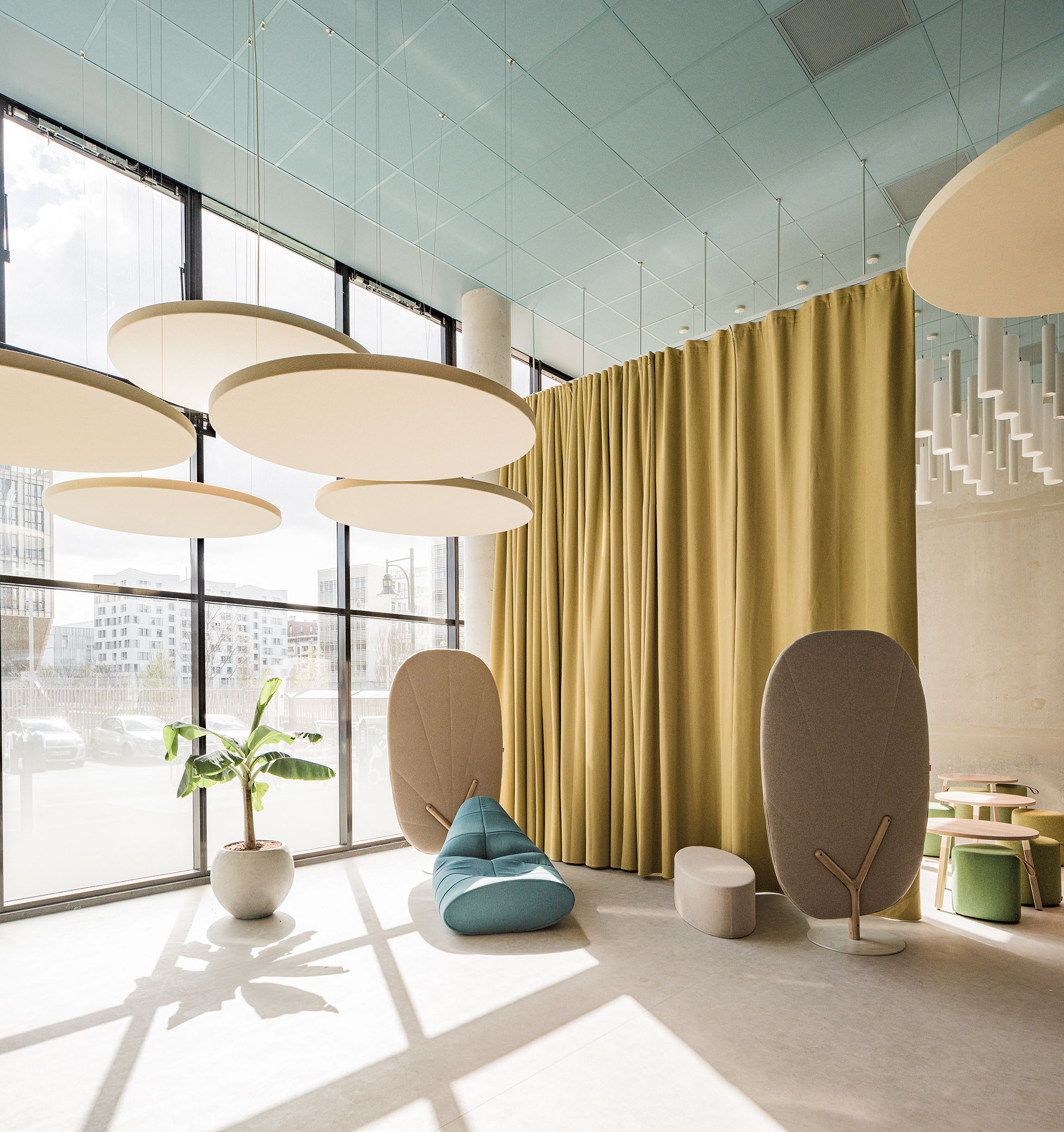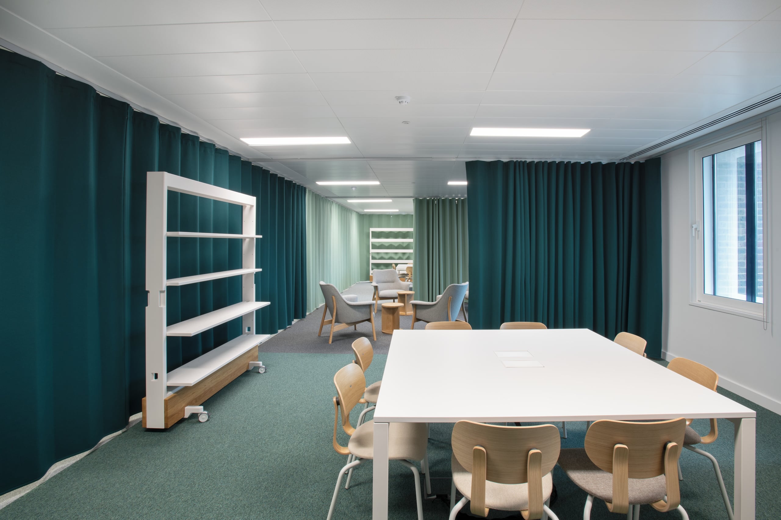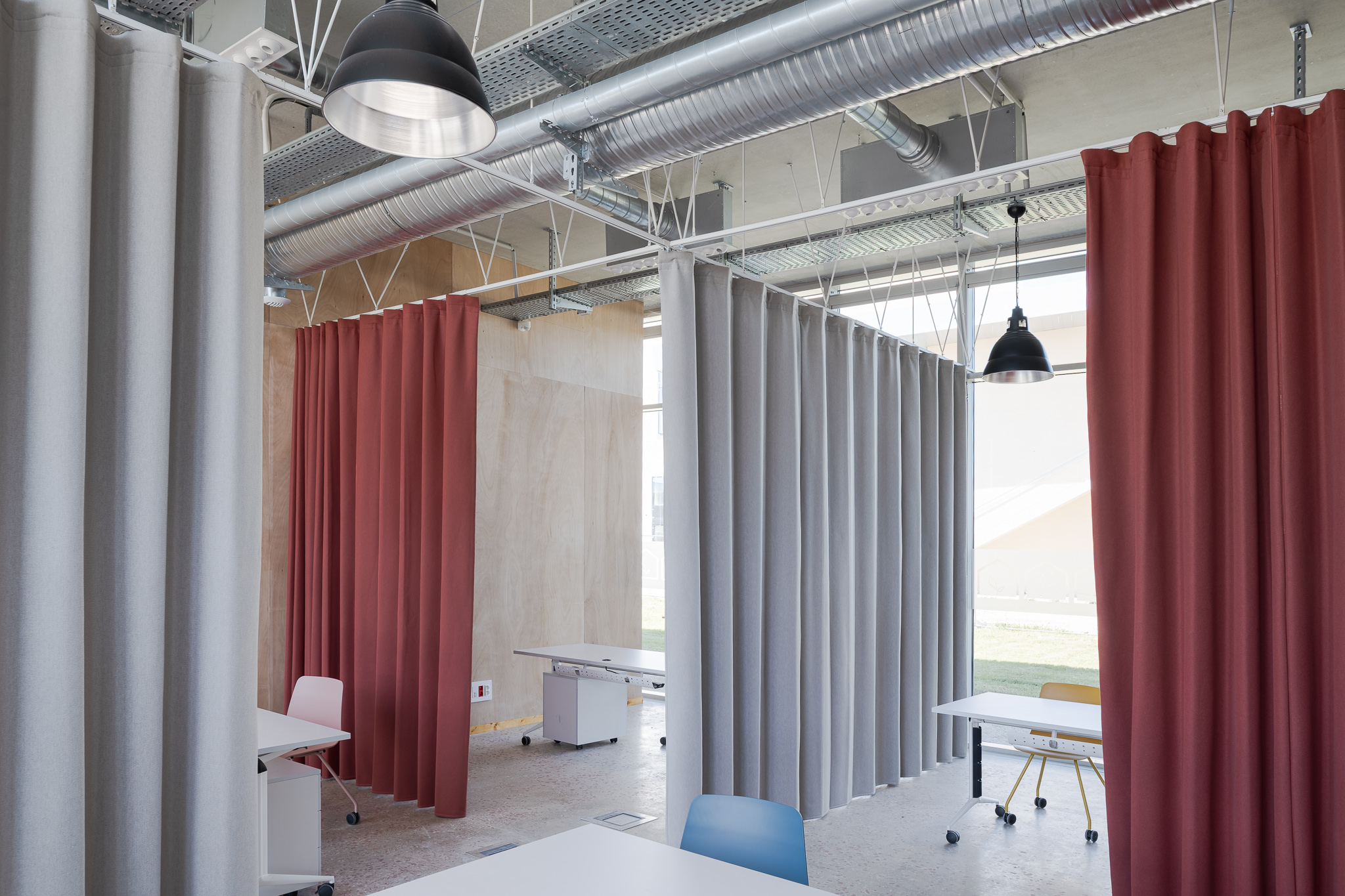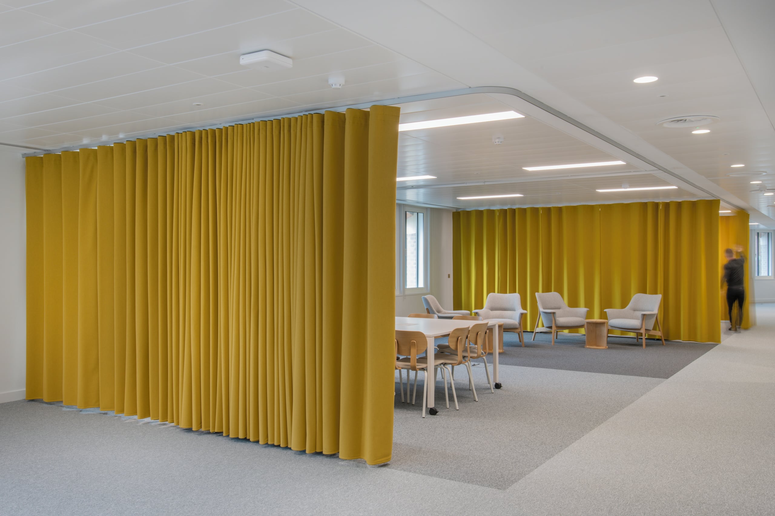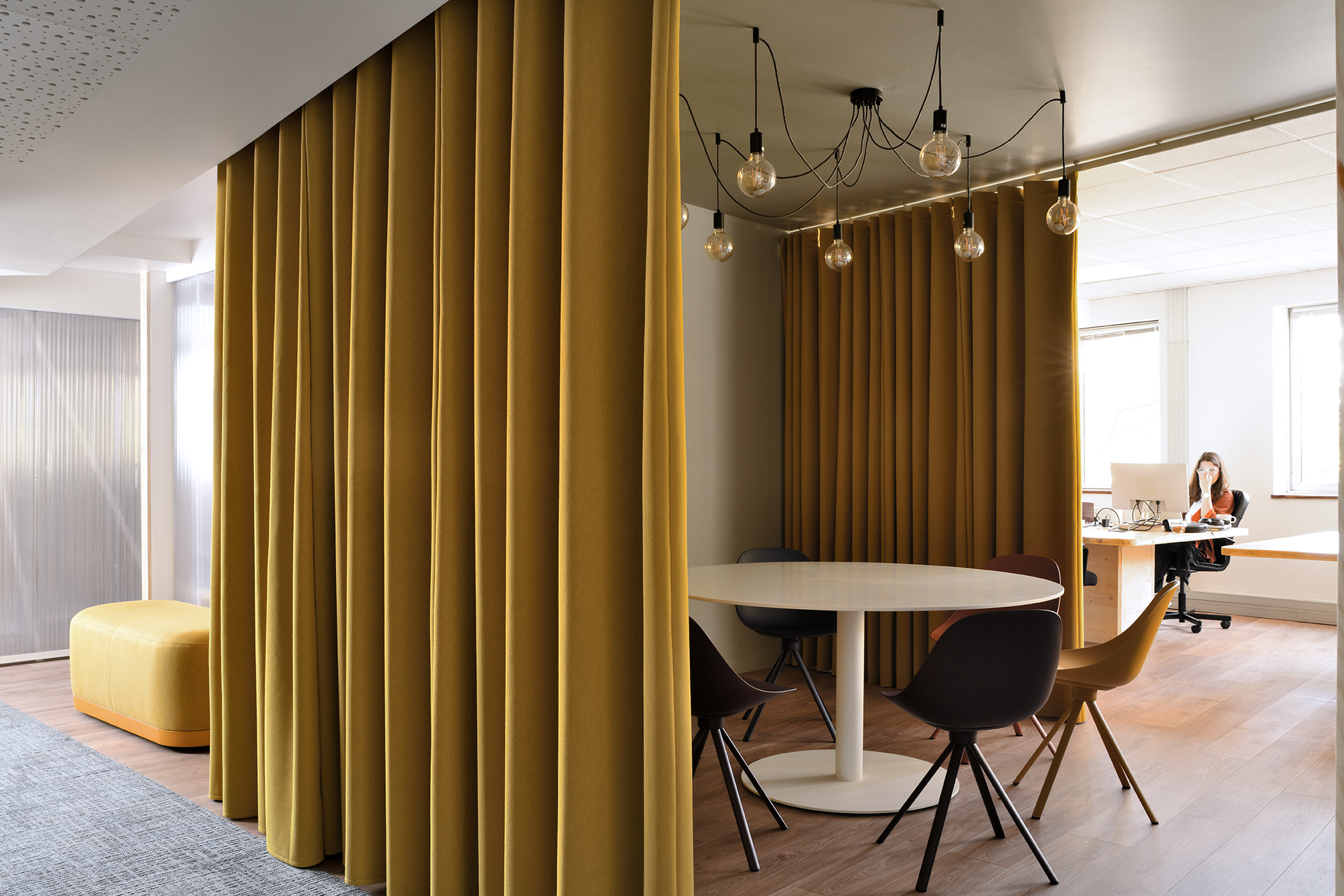 Les rideaux acoustiques atténuants DB permettent de délimiter visuellement des espaces de manière flexible et atténuent la transmission sonore entre deux pièces. Ils délimitent une salle qui peut être totalement ouverte, de manière à ne jamais couper l’espace.