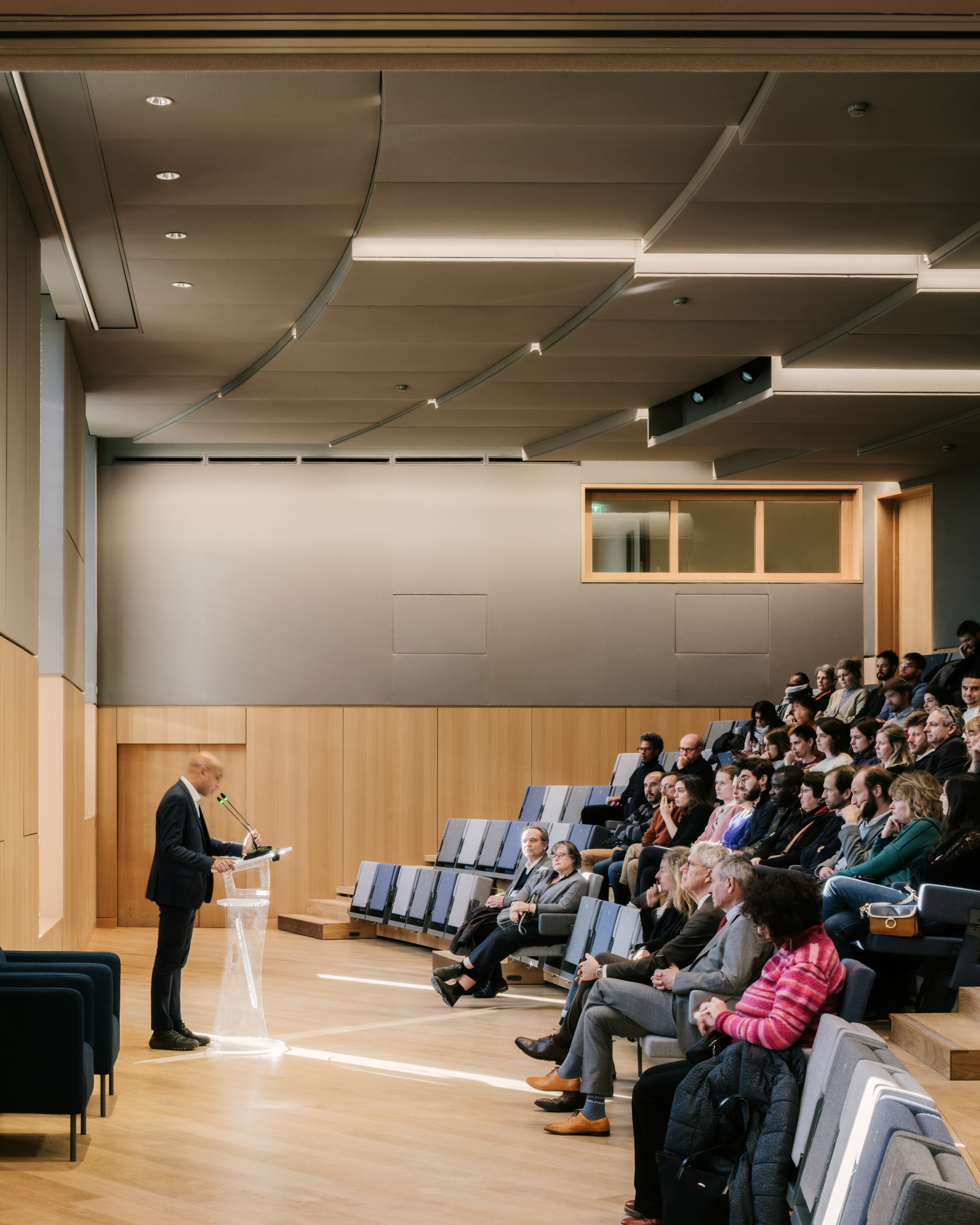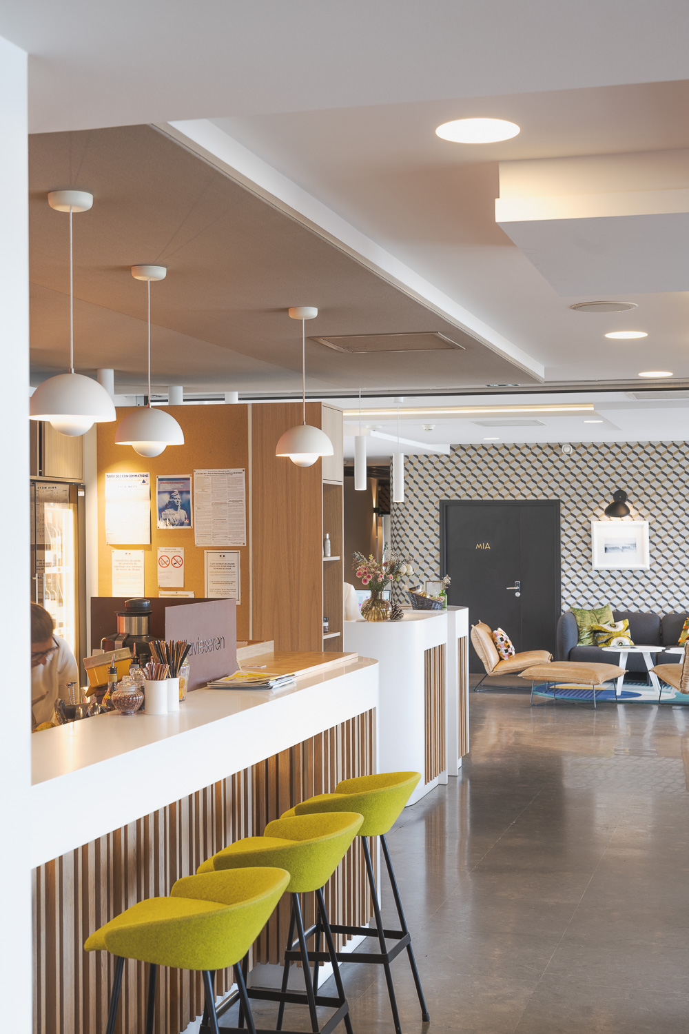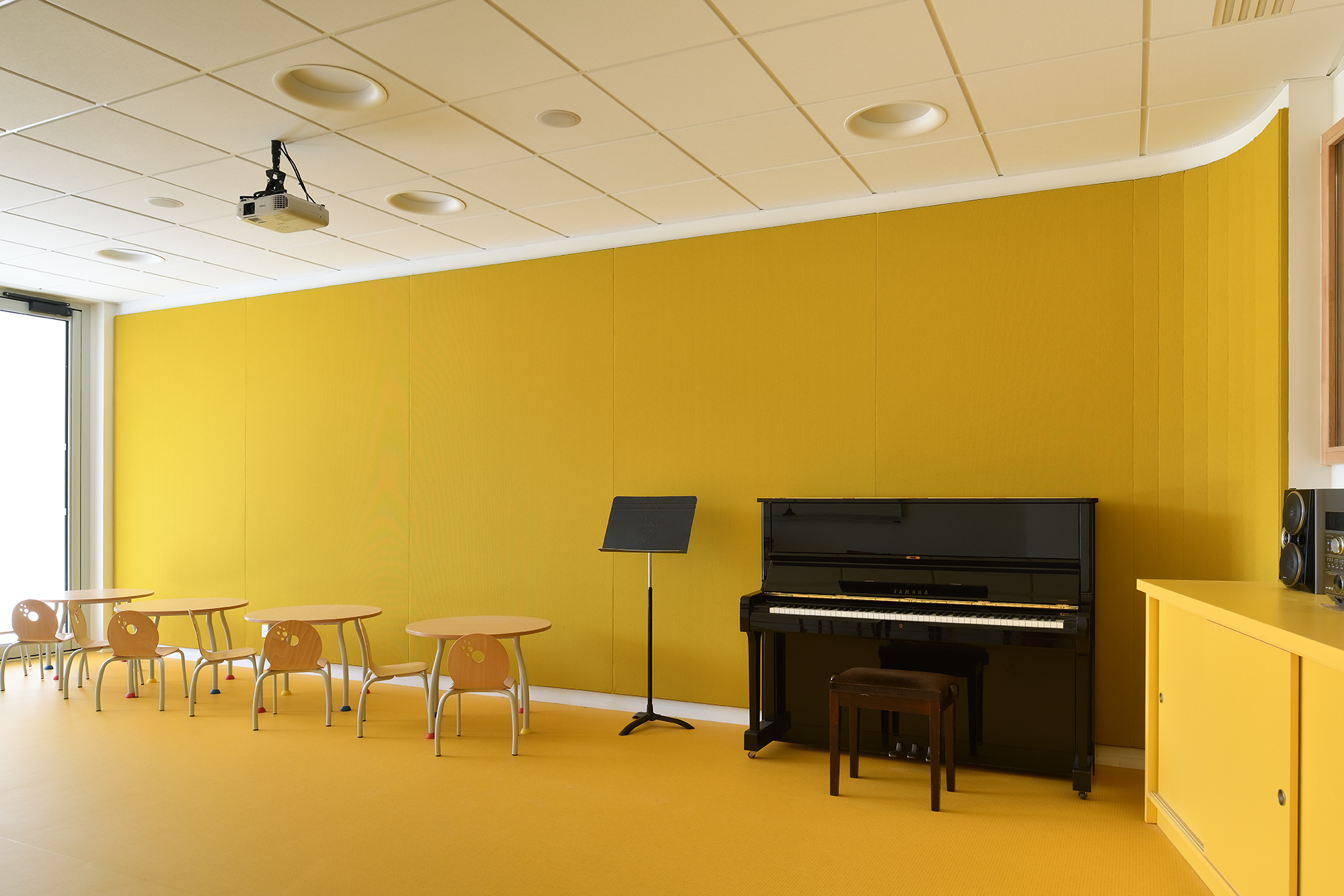 Le parement du revêtement Vibrasto est constitué de textile Aeria, auquel est assemblée une ouate de 3 mm d’épaisseur parfaitement opaque pour masquer les dispositifs acoustiques placés derrière elle.