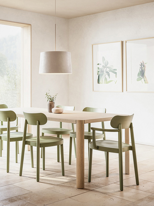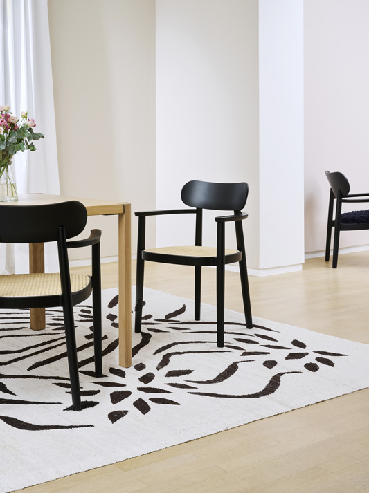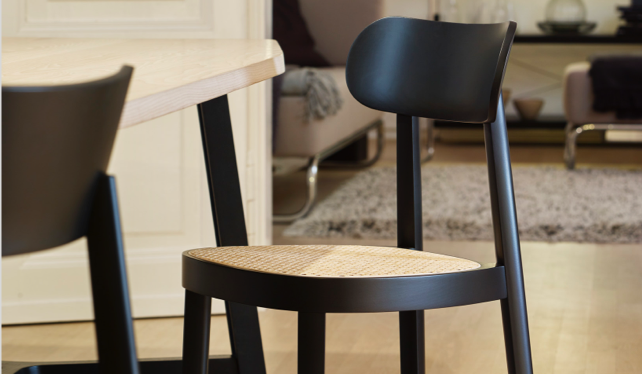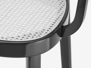 L’archétype d’une chaise en bois courbé Thonet, la 214, est désigné par le cadre de l’assise, qui est plié d’une seule pièce, et l’assise recouverte de cannage et fabriquée à la main. La gamme s’enrichit des tabourets de bar 118 H. Le modèle 118 FV complète la famille des sièges en tant que fauteuil confortable et accueillant. Il est plus spacieux et encore plus confortable : avec une assise plus grande et un dossier plus large légèrement incliné vers l’arrière, il a été conçu par Sebastian Herkner pour la gastronomie.