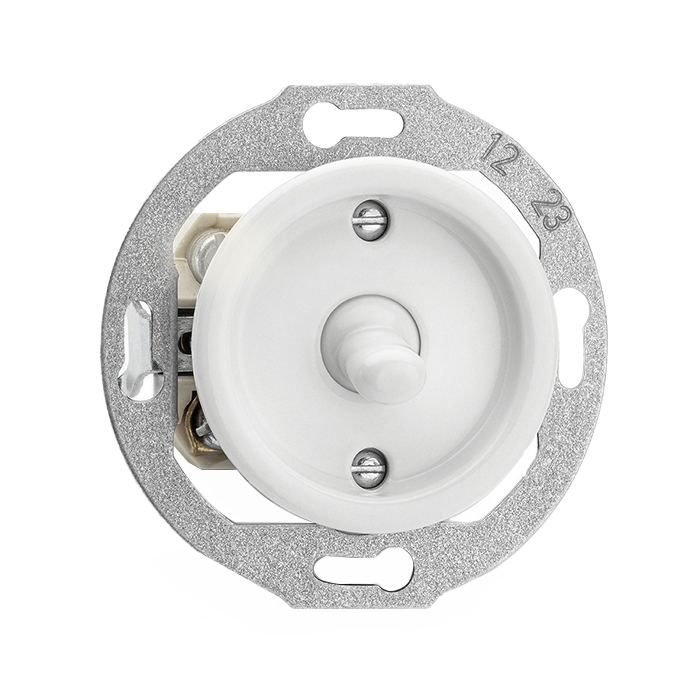 Interrupteur à bascule avec mécanisme de commutation en laiton durable et contacts à vis solides. L’insert central est en porcelaine émaillée transparente, le culbuteur est en thermodurcissable de couleur assortie et le corps de la base est en stéatite, un matériau céramique éprouvé.