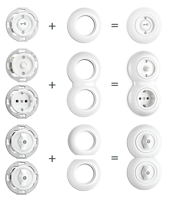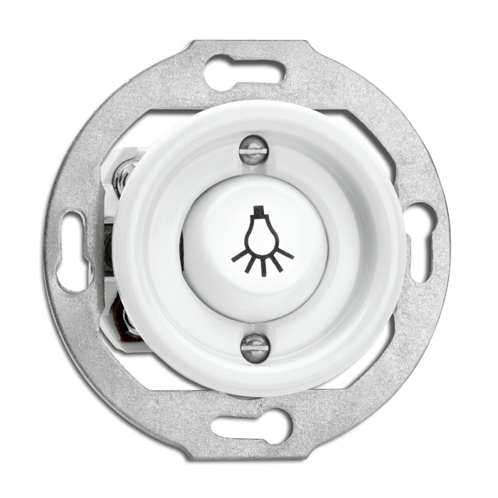 Interrupteur à bascule avec symbole lumineux pour la série d’interrupteurs en porcelaine avec contacts à vis pleins. L’insert central est en porcelaine émaillée transparente, la bascule est en thermodurcissable de couleur assortie et le corps de la base est en stéatite, un matériau céramique éprouvé.