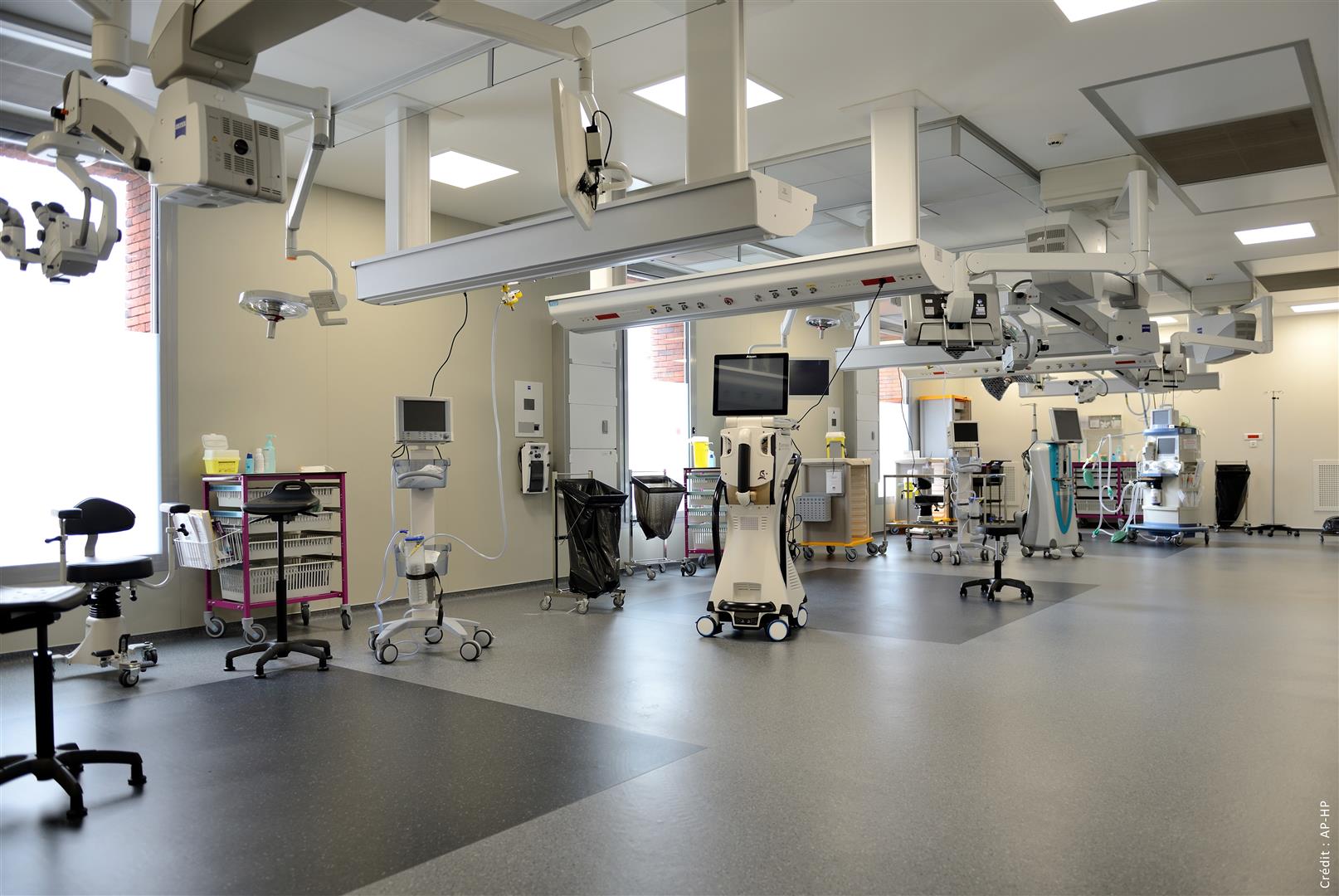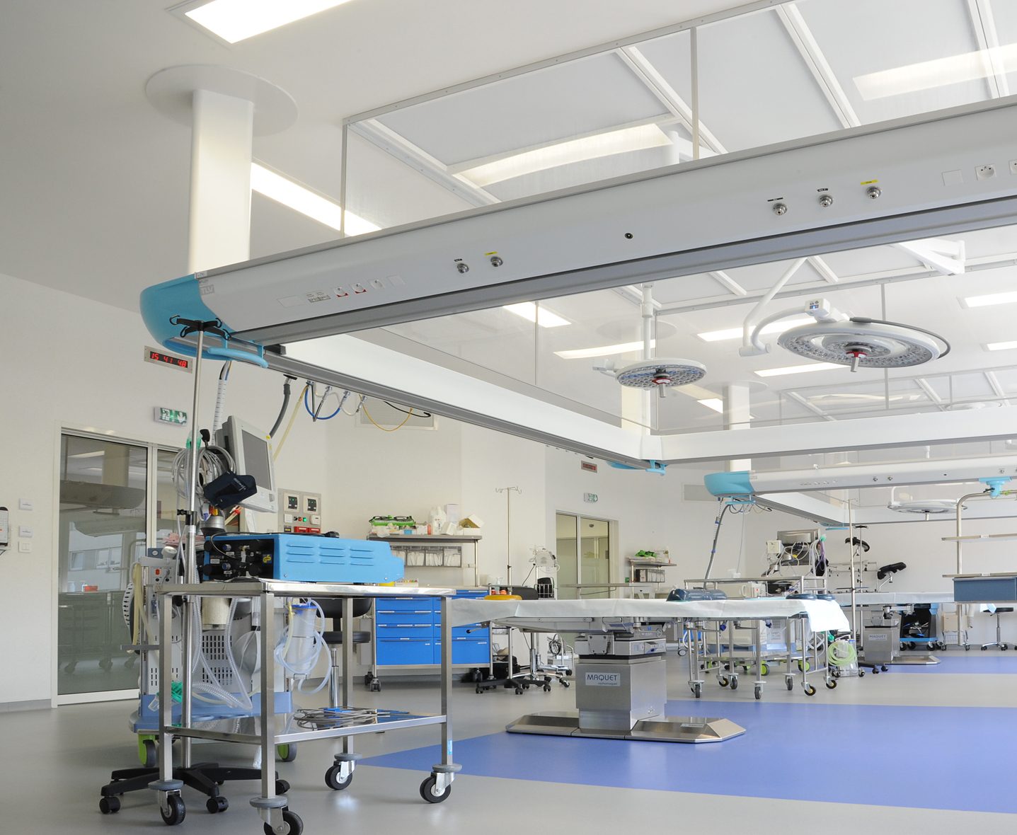 La poutre suspendue périphérique HI-CARE présente l’avantage de mutualiser la majorité des personnels des équipes d’anesthésie et de chirurgie. Cela, afin de favoriser la rotation des patients et l’enchainement des programmes. En effet, ce concept de bloc opératoire centralise l’activité dans un lieu unique.