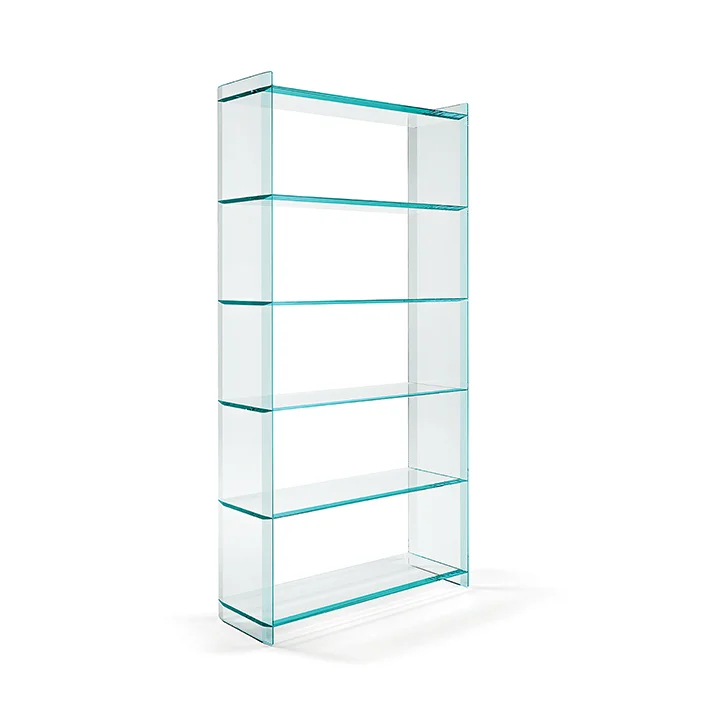La bibliothèque Quiller est réalisée en verre biseauté extra-clair et est composée de six étagères fermées sur les côtés. Il a été conçu par Uto Balmoral et est parfait pour être positionné sur le mur ou posé dans les espaces de vie ou de travail .