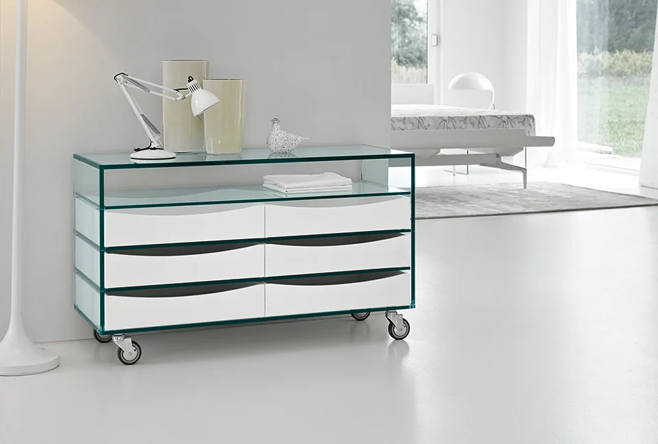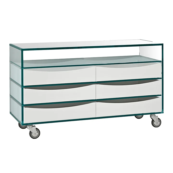 | Matériau(x) | Structure : Verre transparent ou extra-clair. / Tiroirs : Disponibles en bois wengé, chêne blanchi, noyer canaletto, cuir naturel ou noir, ou laqué mat dans toutes les finitions RAL |