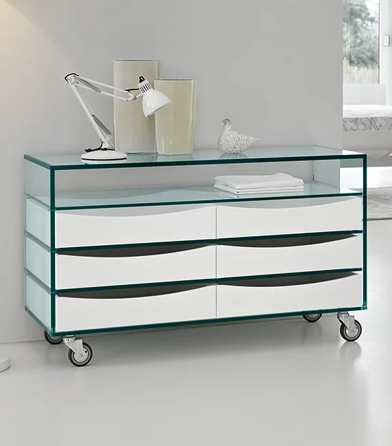 Conçue par l'architecte Marco Gaudenzi , la commode haute présente une structure en verre transparent ou extra-clair et est équipée d'étagères.