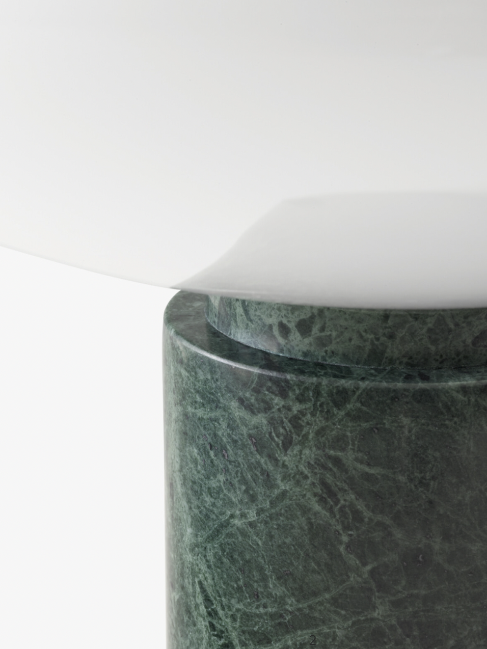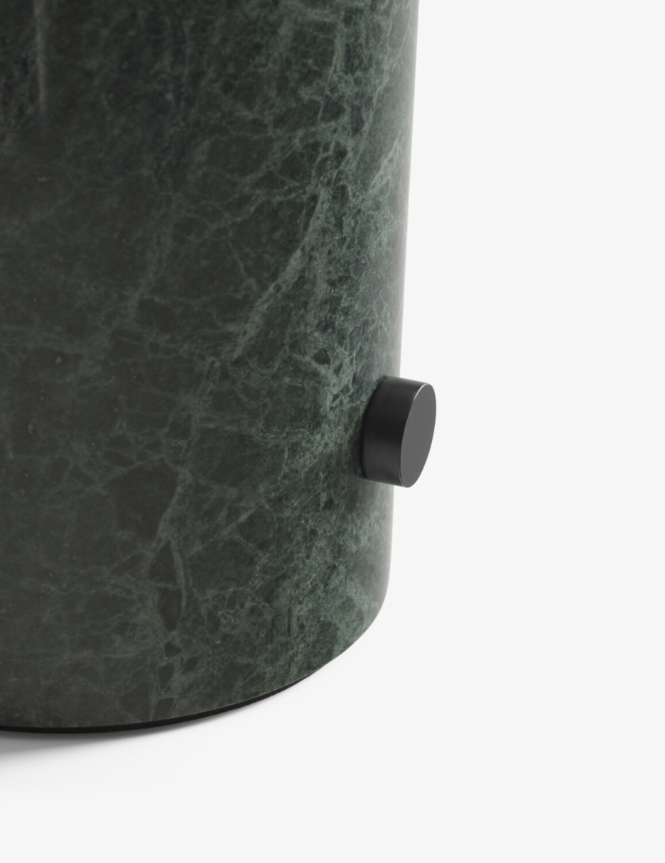 The Mist table lamp, made from mouth-blown opal glass, features a thick marble pillar with a small dimmer switch. The contrast between the light shape of the glass and the solidity of the marble creates a graceful design rich in materiality and character.