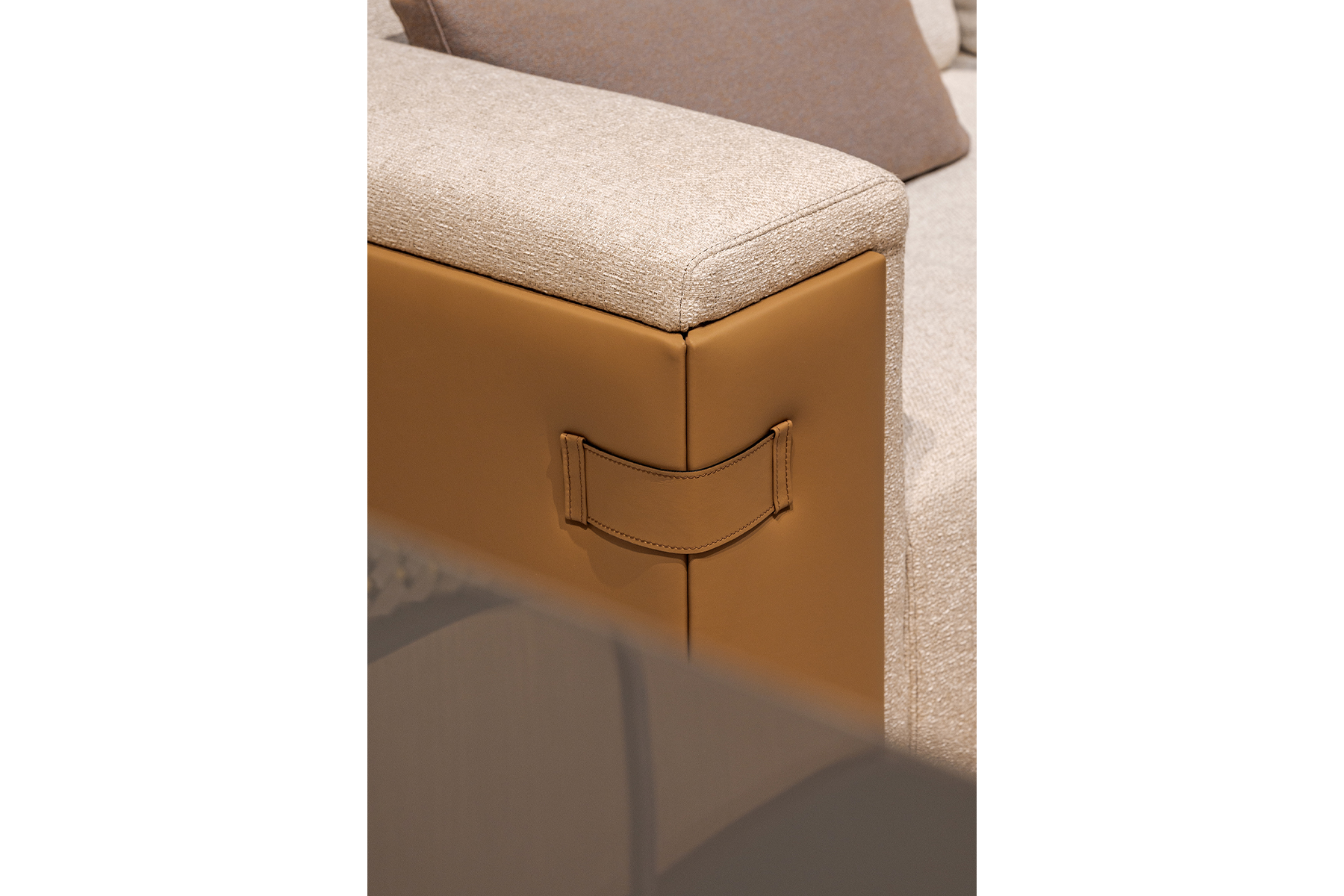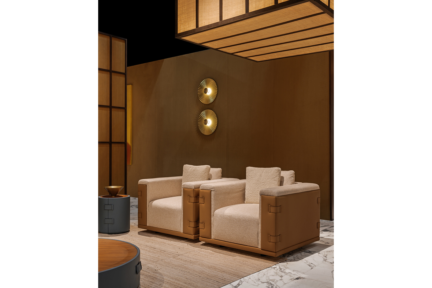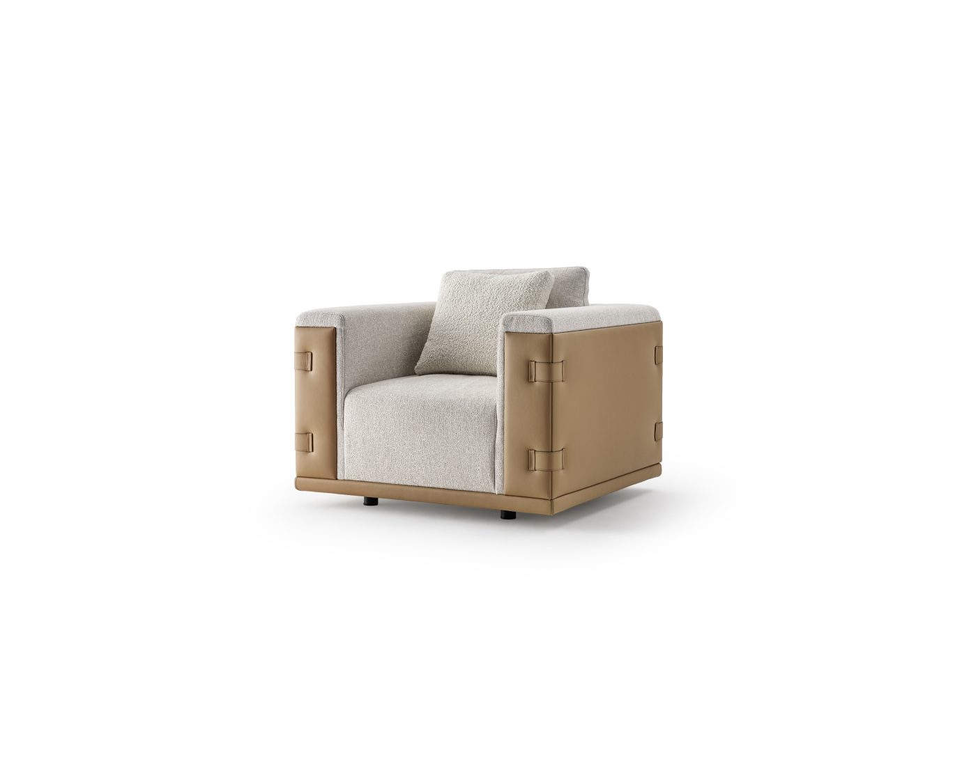 Le fauteuil Atelier, avec sa structure extérieure et ses inserts en cuir, souligne l’inspiration de la maroquinerie et de la mode italienne, captivant l’attention grâce à son rembourrage en tissu et promettant confort et style avec son large assise.