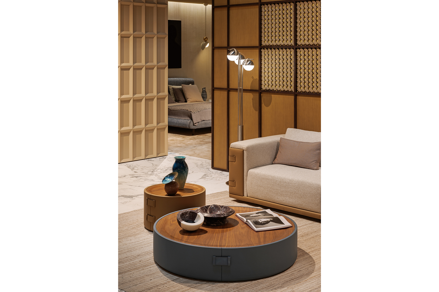 De forme cylindrique et disponibles en différentes hauteurs, les tables basses Atelier ont une structure recouverte de cuir avec application de boucles en cuir qui, dans l’élégance de la maroquinerie italienne, les finitions détaillées rappellent la maîtrise vestimentaire et la précision des accessoires haut de gamme. à la mode, tout en offrant fonctionnalité et style. Par ailleurs, les tables basses ont été conçues avec des plateaux en bois de noyer, légèrement biseautés vers l’intérieur, rappelant la douceur de la mode contemporaine. Les inserts en cuir ont été soigneusement choisis, devenant ainsi un élément distinctif et unificateur de toute la collection.