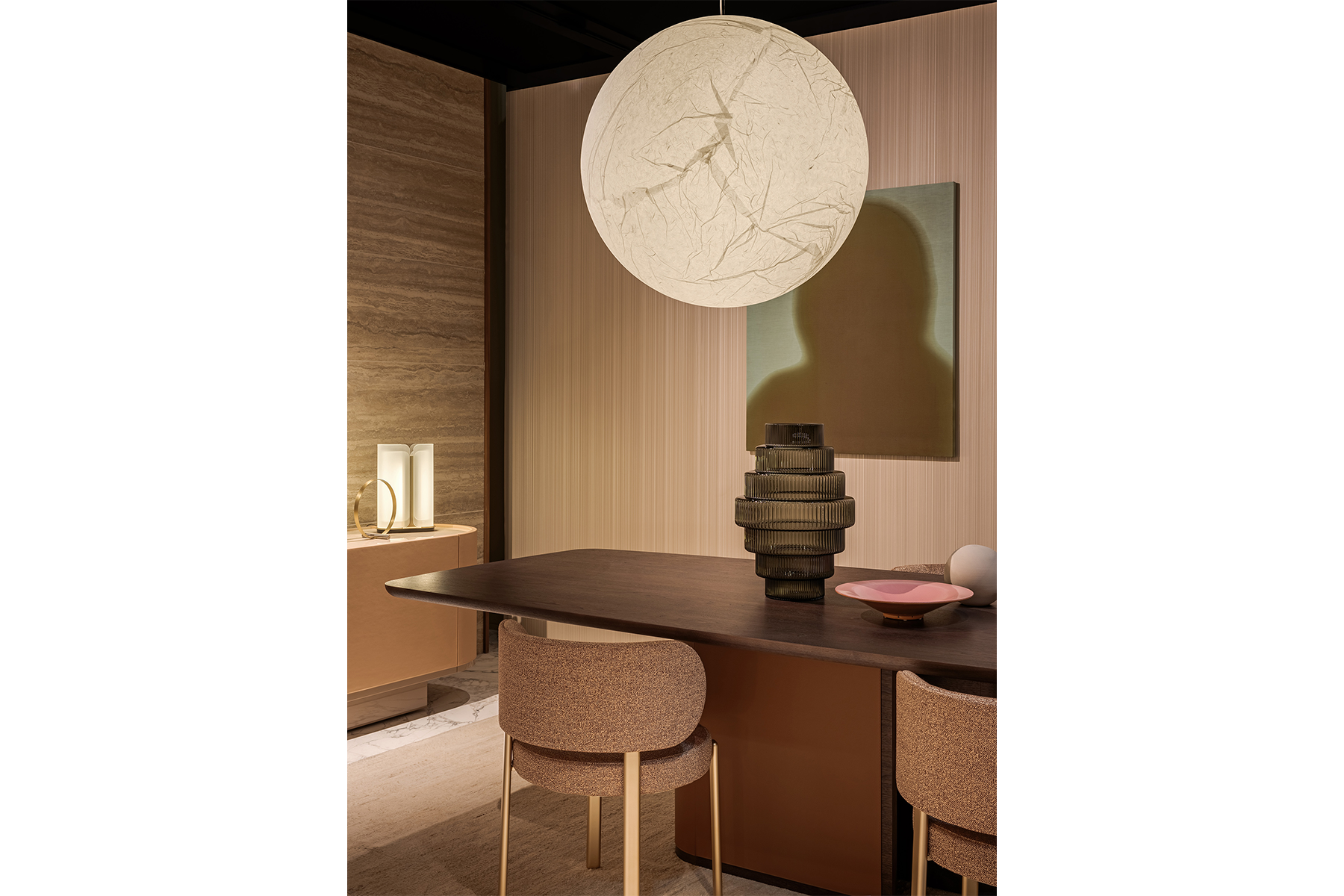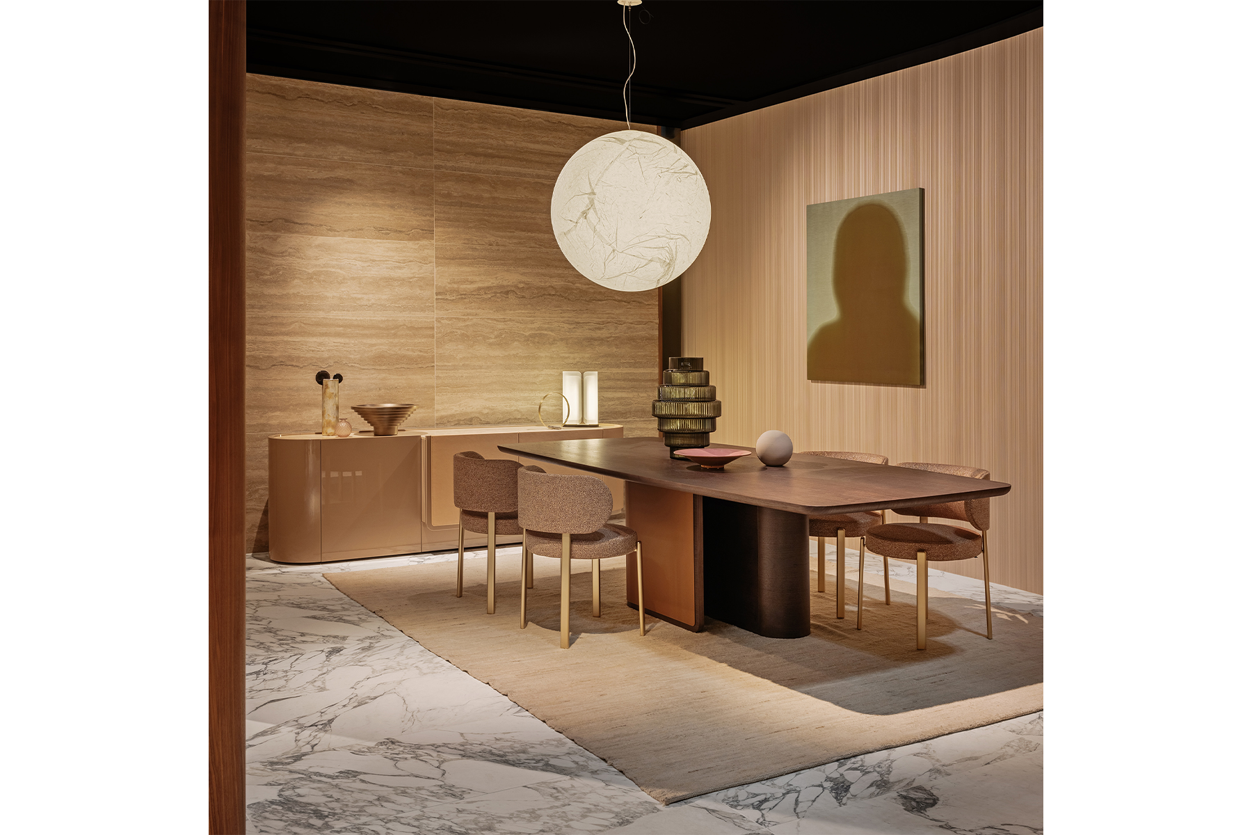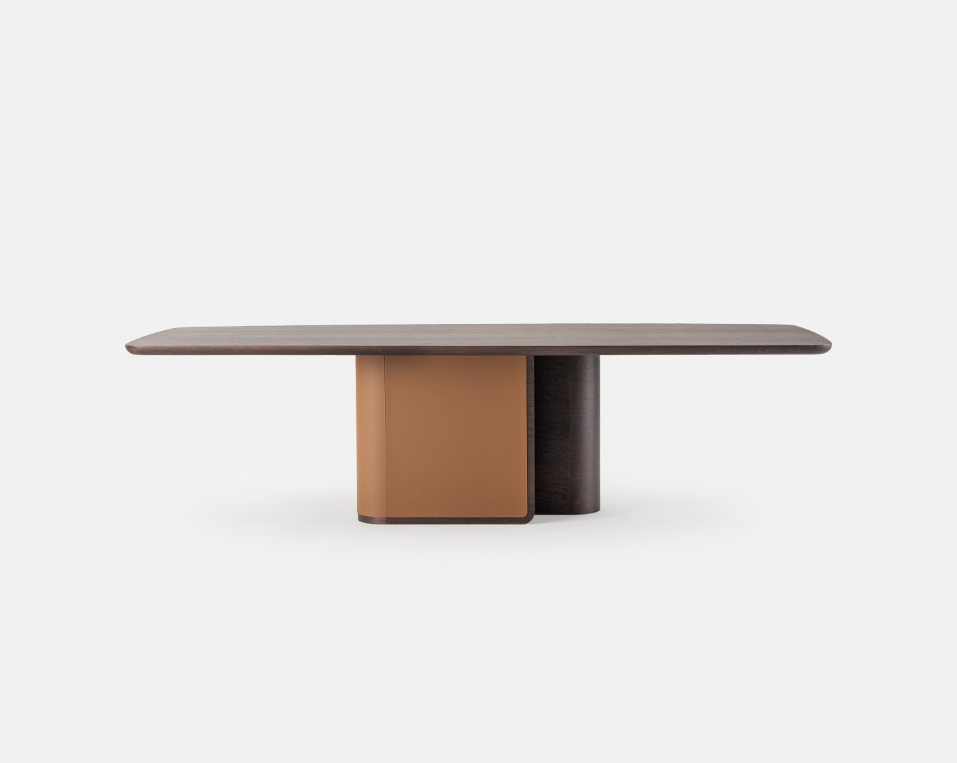 La table Echo se caractérise par une base solide qui rappelle la torsion d’un cylindre en train de se former. Cette table accueille un plateau en forme de tonneau, également aux lignes arrondies, qui révèle une attention particulière aux détails : une partie de la base en bois est recouverte de cuir, tandis que le reste de la table est en bois de noyer, avec la possibilité d’opter pour un dessus de marbre.