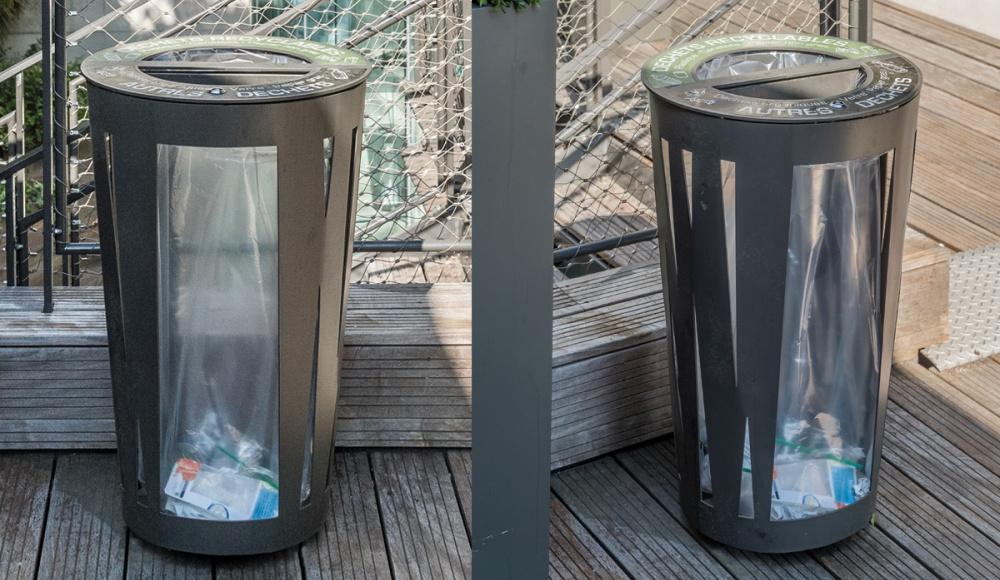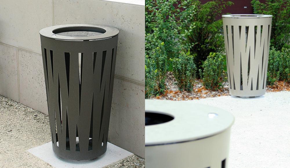 Le + : un design singulier, contemporain, des adaptations possibles : Corbeille Evolution vigipirate, tri sélectif, couvercle protège pluie.
