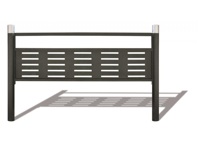 Barrière en acier composée de potelets Ø76mm (POT4300), main courante en fer plat 40x15 et remplissage par tôle ajourée. Cette barrière peut faire office de garde corps en les assemblant bout à bout. Hauteur hors sol main courante : 900 mm Hauteur hors sol potelets : 1000 mm
