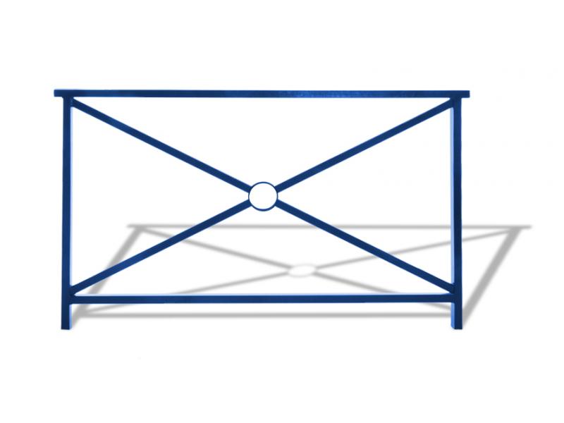 Barrière en acier, montants en tube section 35x35mm, main courante en tube rectangulaire 40x27mm, croisillon de 30x30mm et rond central.