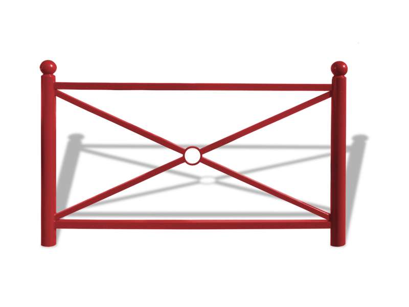 Barrière en acier composée de potelets Ø76mm (POT4600A), main courante en tube 40x40mm, croisillon en tube 30x30mm, avec rond central. Hauteur hors sol main courante : 960 mm Hauteur hors sol potelets : 1080 mm