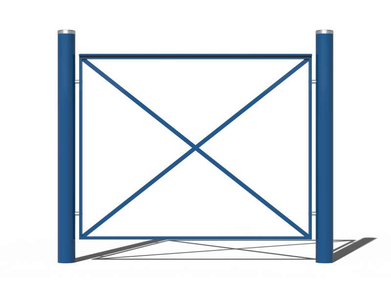 Barriere en acier composée de 2 potelets INCHA avec tête en inox (réf: POT6300) et d’un cadre en fer plat section 30x12 mm avec croisillon en carré de 18 mm et main courante moulurée 40x10 mm.