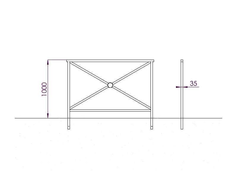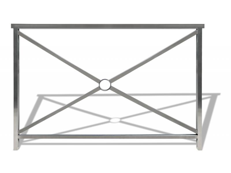 Barrière en inox 304L constituée de montants et main courante en tubes 35x35mm, croisillon en tubes 30x30 mm et rond central. Hauteur hors sol : 1000mm