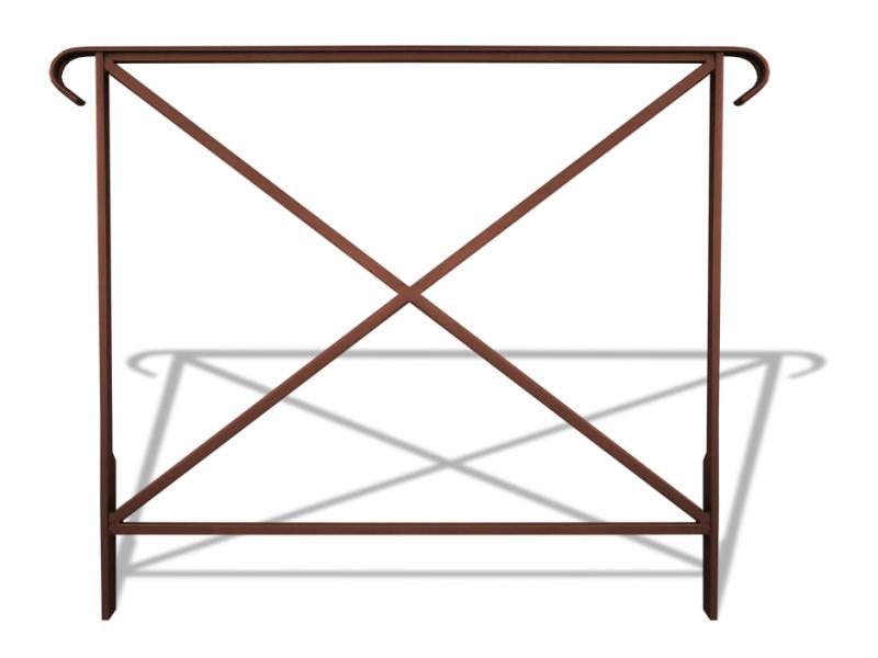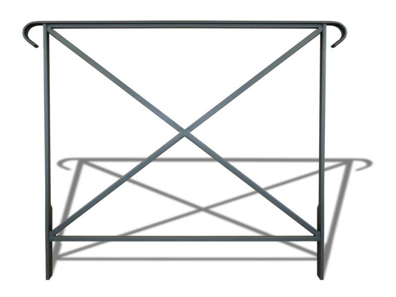 Barrière en acier constituée de montants en fer plat 30x12mm, main courante moulurée 40x10mm et croisillon en carré de 18mm.