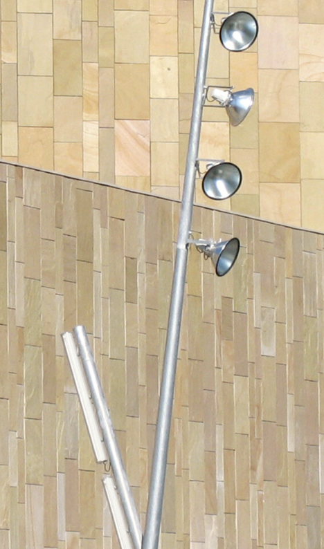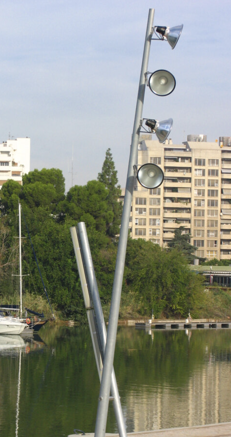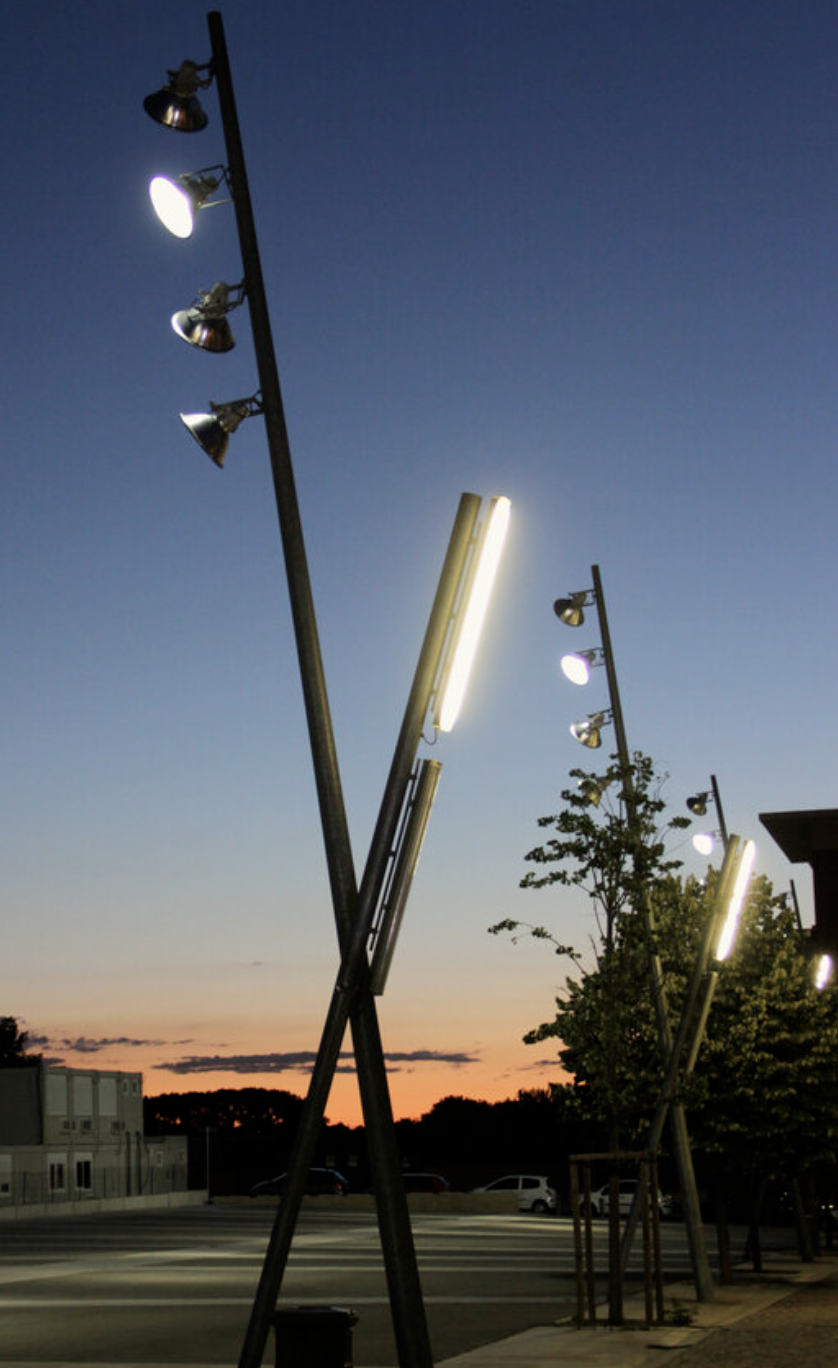 Deux bras distincts et deux systèmes d'éclairage : l'un diffus et l'autre direct. La colonne la plus haute, de section tronconique, mesure 10 m de long et sert de support à quatre projecteurs Arne orientables. L'autre colonne, d'une longueur de 6 m, sert de support à deux modules linéaires.