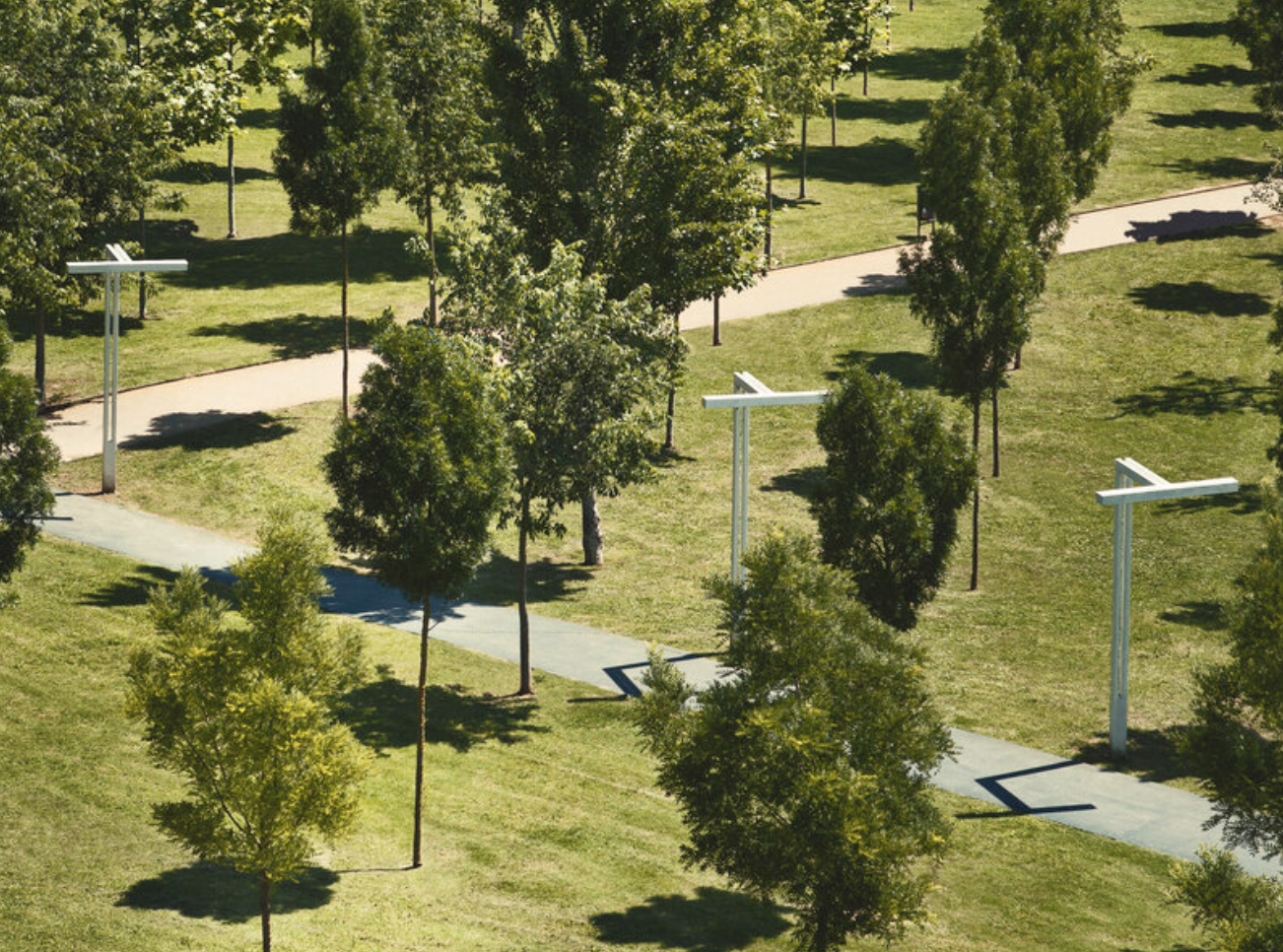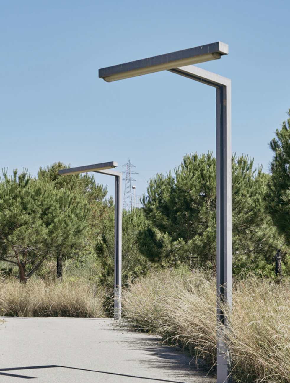 Élément aux lignes très géométriques, sa morphologie unique en T permet des rails lumineux légers de longueur variable et stimule la construction de pergolas urbaines généreuses. Le mât bifide génère un angle de 90º lors de la jonction avec le corps lumineux.