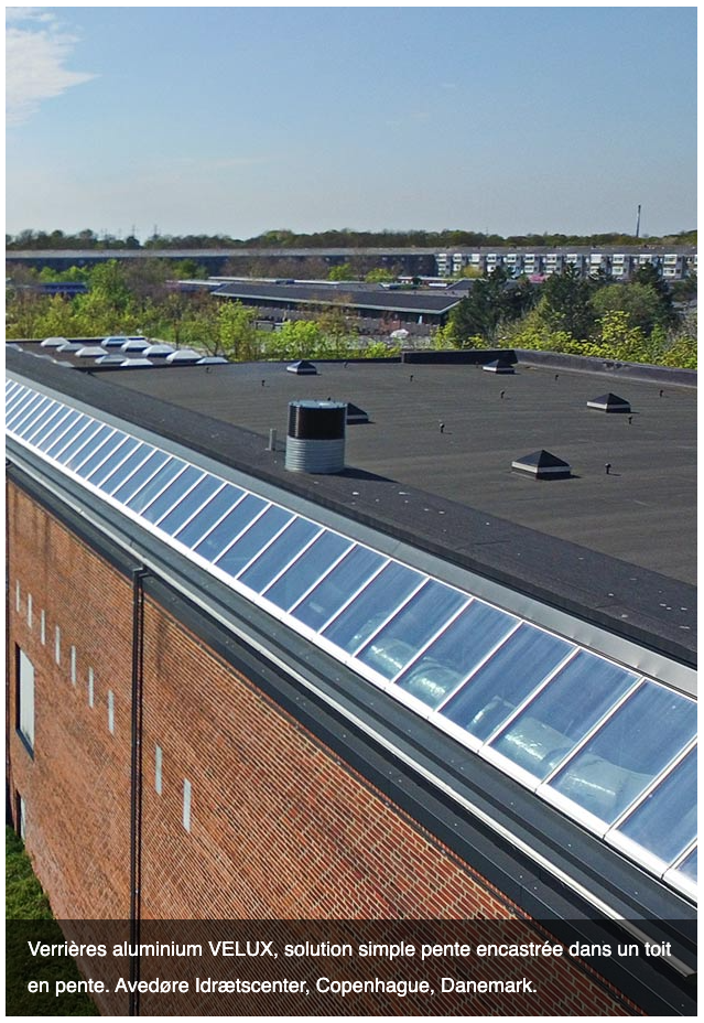 Le produit Verrière mono pente du fabricant VELUX classé dans la catégorie Menuiseries extérieures > Murs rideaux - verrières > Murs rideaux et verrières en verre extérieur attaché (VEA) est référencé dans la Matériauthèque digitale Materiaux.archi.