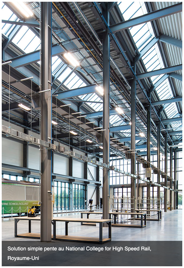 Les verrières mono pente sont des rangées simples de panneaux qui éclairent les halls d'accueil, les couloirs et les grandes pièces. Les verrières s’installent entre 15 et 90°, sur une costière (sur un toit plat), ou s’intègrent dans les toitures en pente. Les solutions montées au sommet d'un mur vertical peuvent être installées avec des inclinaisons entre 15 et 60°.