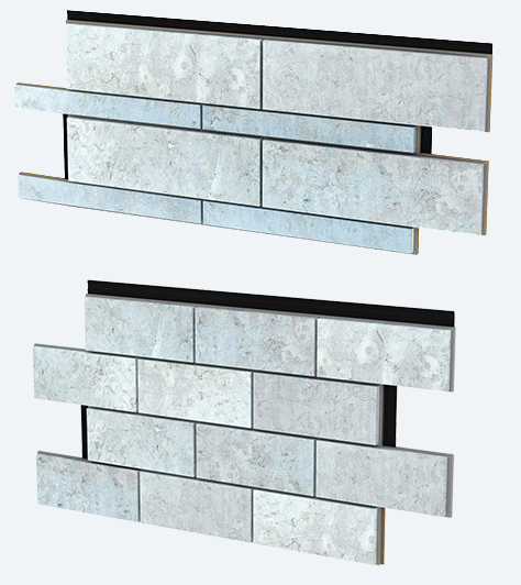 Les panneaux sont posés horizontalement. Le système de recouvrement horizontal par bordures PVC et d’emboitement vertical permet d’obtenir un rendu parfait. La disposition des panneaux s’effectue par rangées horizontales. Les jonctions entre panneaux sont filantes ou décalées. Les fixations principales sont disposées dans les bordures PVC entre plaquettes. Quelques fixations complémentaires traversantes sont disposées aux points singuliers. Ce système ne nécessite pas de jointoiement.