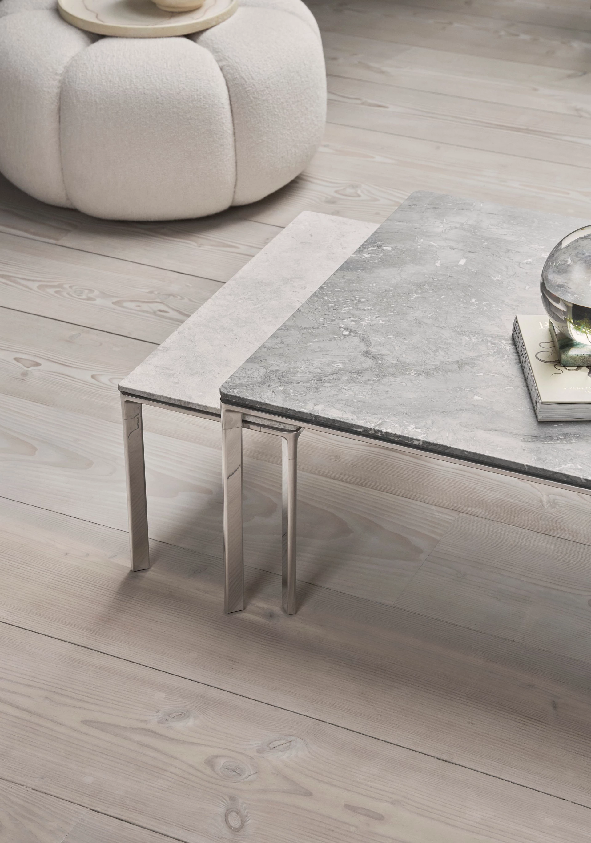 Dotées d'un cadre à quatre pieds en aluminium poli et d'un plateau de table en marbre. Disponible en deux tailles et avec deux variantes de marbre différentes, le mélange de grès organique contraste avec la robustesse du cadre. Les tables basses peuvent être exposées en solitaire ou jumelées pour une composition complète de table basse. Utilisez la plus petite table basse comme table d'appoint pour le canapé Vipp610 Loft ou le canapé Vipp632 Chimney.