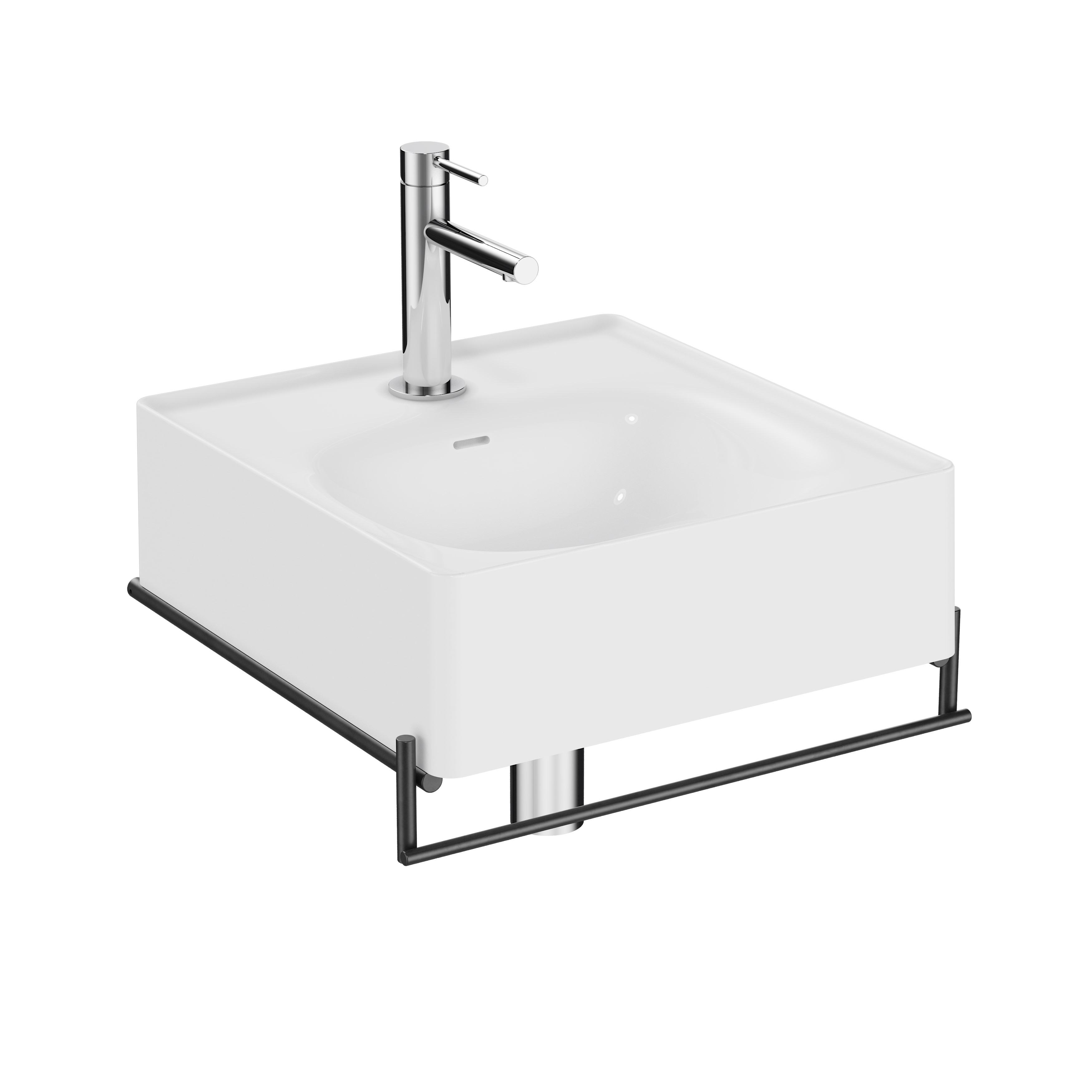 Equal Lavabo Blanc Brillant, avec porte-serviettes, mural - 1 trou central pour robinet, avec trop-plein en forme d’amande et Porte-serviettes en métal noir mat laqué.