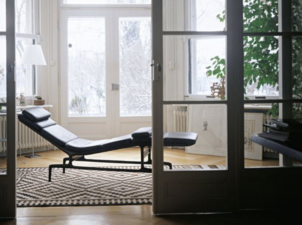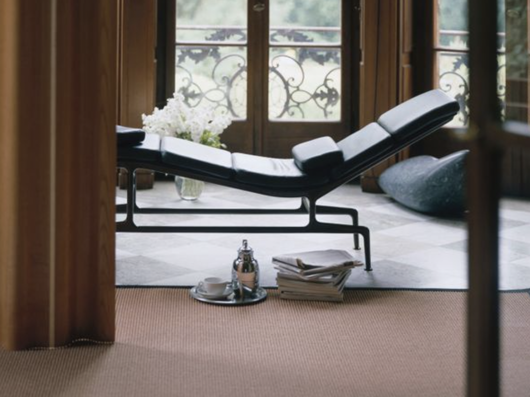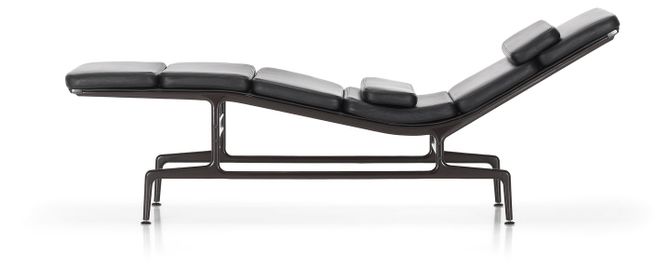 Le réalisateur américain Billy Wilder, ami de longue date de Charles et Ray Eames, est à l’origine de la création de ce meuble : il recherchait une chaise longue qu’il voulait utiliser pour des moments de détente ou de petites pauses durant le tournage. Six coussins reliés par des fermetures éclair sont fixés sur le cadre en aluminium, deux autres coussins mobiles viennent parfaire le confort.