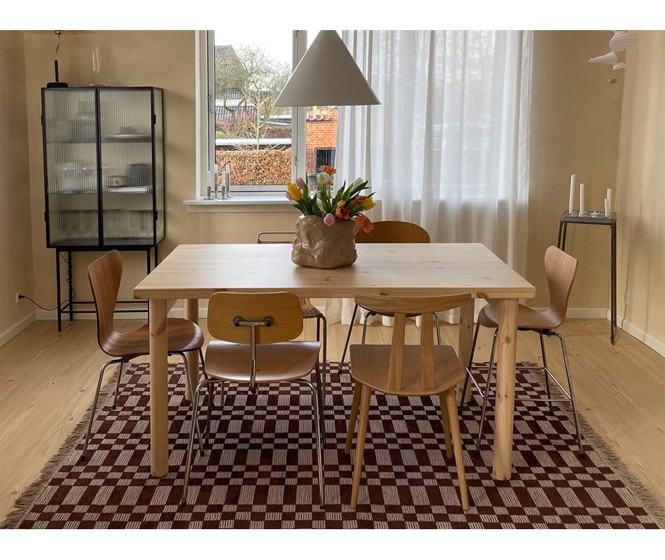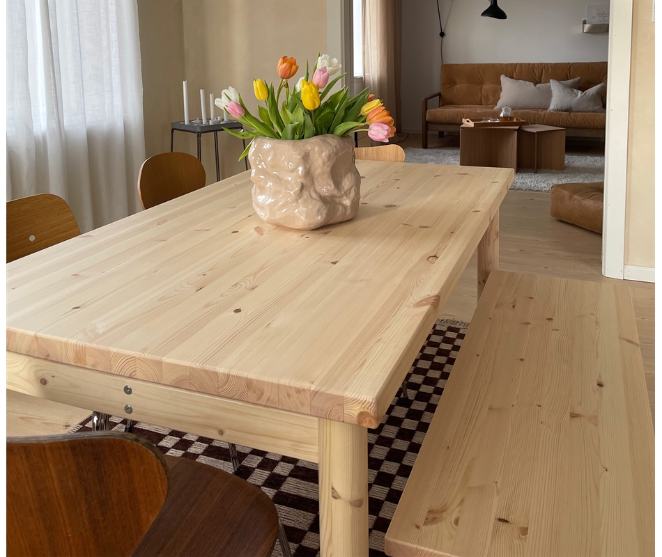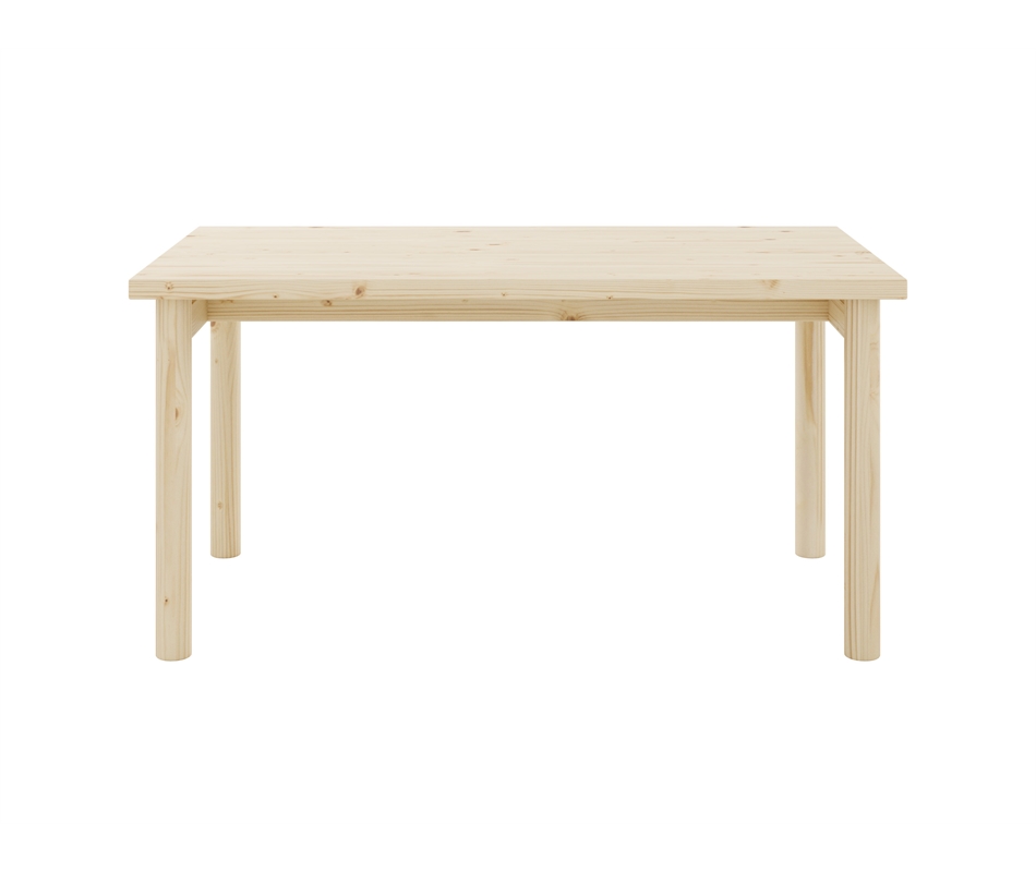 Table à manger pour quatre personnes, en pin scandinave massif d'une hauteur de 75 cm. Les formes simples et géométriques se combinent avec l’aspect rustique et noueux du bois de pin. La structure légère et peu encombrante est parfaite pour une cuisine ou un petit appartement. Il s'agence facilement au banc Pace, réalisé dans le même design. Peint avec un revêtement de laque à l'eau, il est disponible en couleur Naturel.
