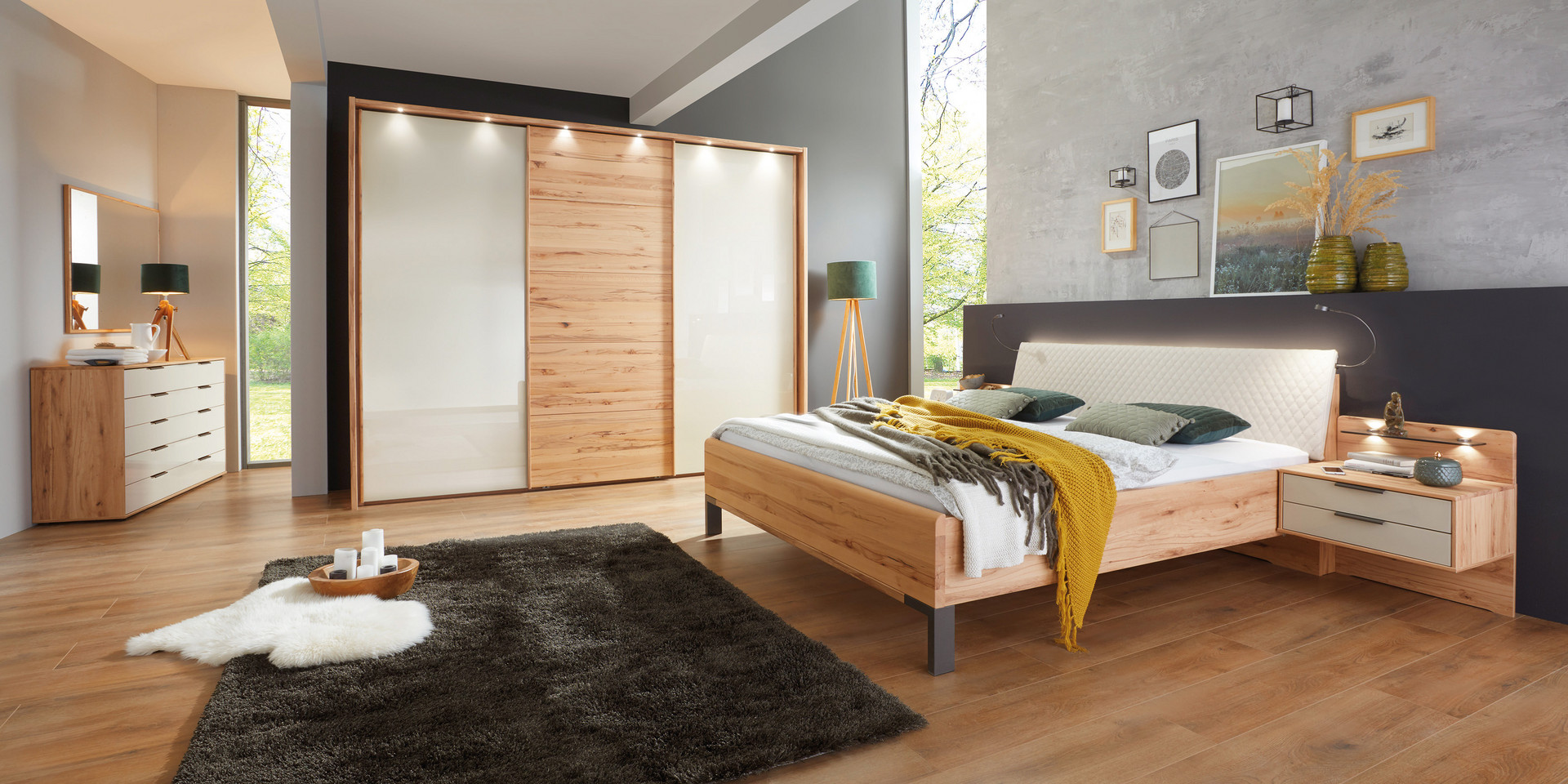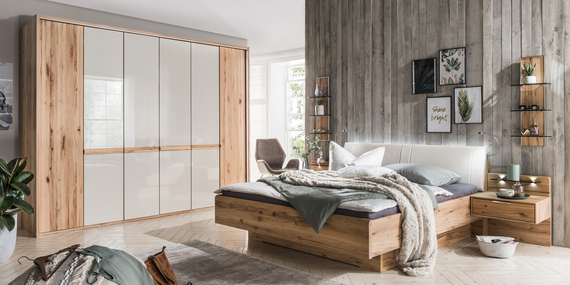 Moderne, naturelle et robuste : la série de meubles Livourne, fabriquée à partir de la nouvelle essence de bois de hêtre à âme nouée, transforme votre chambre à coucher en un refuge pour les amoureux de la nature grâce aux nuances de bois sombres et clairs. En plus de la grande variété de futons, les armoires à porte battante et coulissantes sont disponibles en deux versions de carcasse et de façade de couleurs différentes, y compris une façade en verre ou un miroir en cristal, et prouvent une variété optimale de combinaisons grâce à un grand choix de meubles supplémentaires, composés de tables de chevet, de commodes et d’étagères.