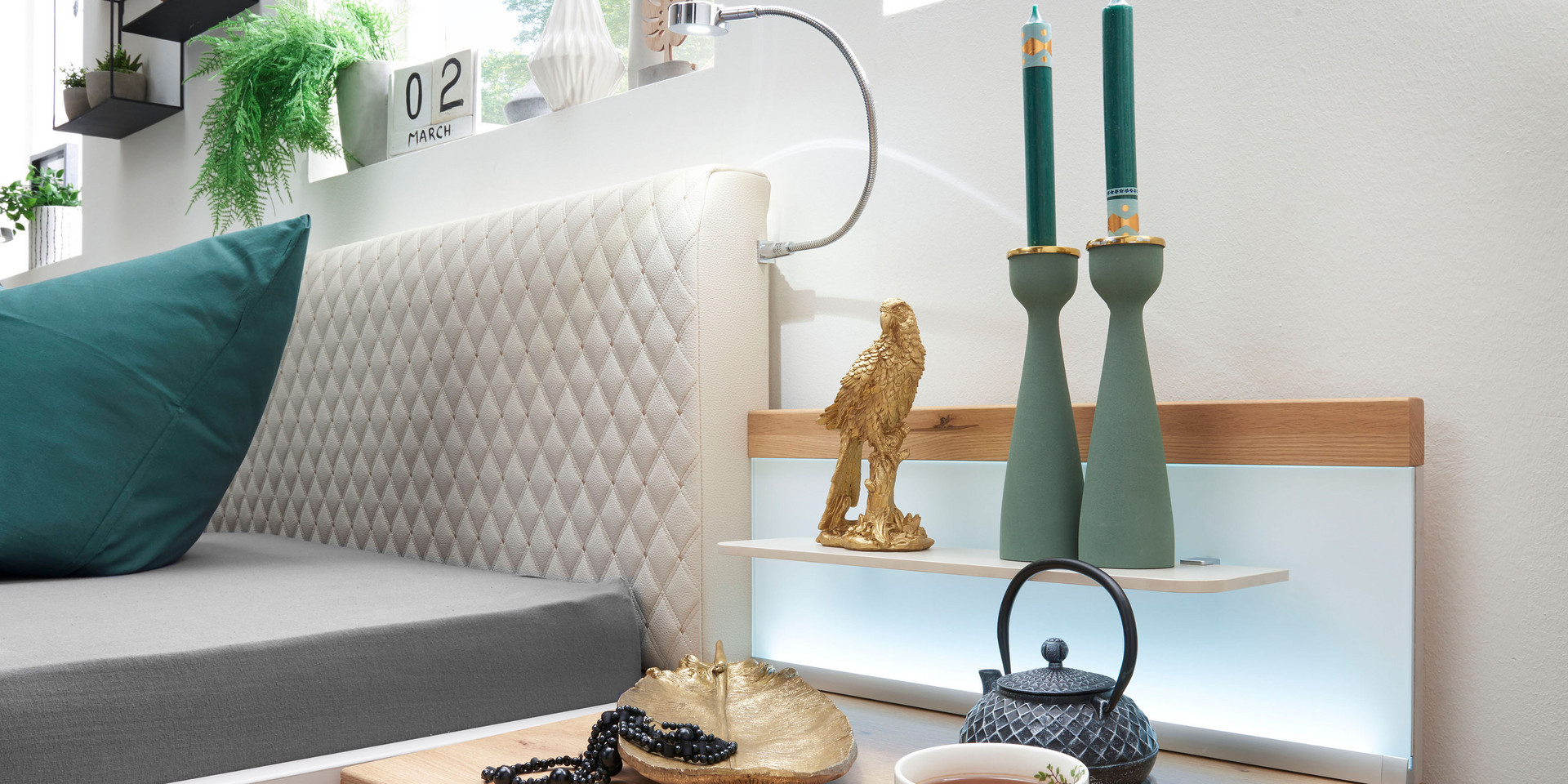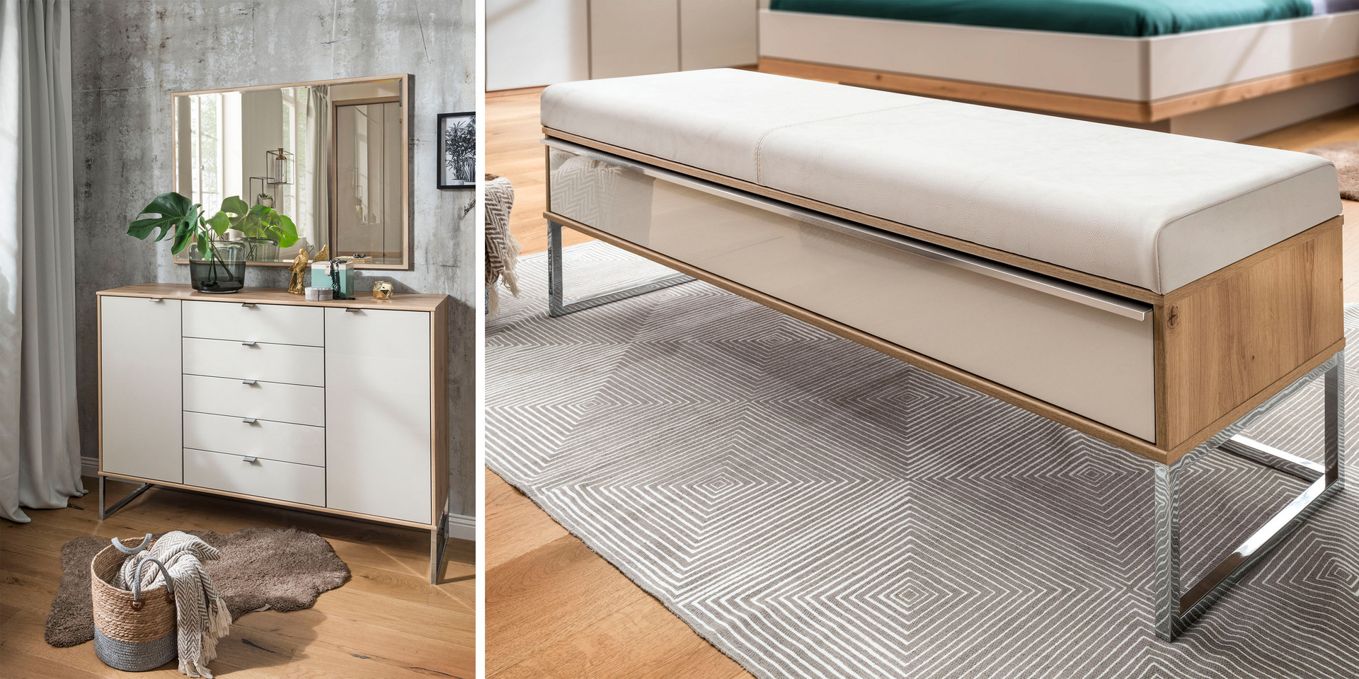 Bien entendu, BARCELONA propose également des tables de chevet en quatre variantes et des panneaux assortis. Des commodes de différents designs, des bancs d’habillage et des miroirs muraux complètent parfaitement l’offre, de sorte que rien n’est laissé à désirer.