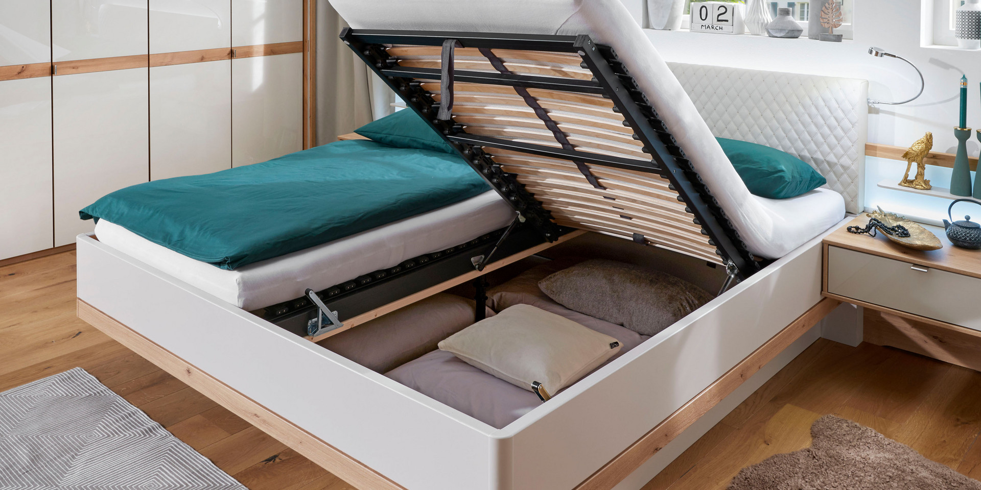 Dormez bien - le lit avec la tête de lit rembourrée confortable et en même temps chic avec un matelassage en diamant moderne vous invite à vous attarder et à rêver. Malgré l’aspect flottant du cadre de lit, vous pouvez obtenir un sommier sous-plan pour plus d’espace de rangement sous le lit. Le meilleur accès possible au sommier est assuré par les sommiers à lattes avec ressorts, que vous pouvez acheter en option.