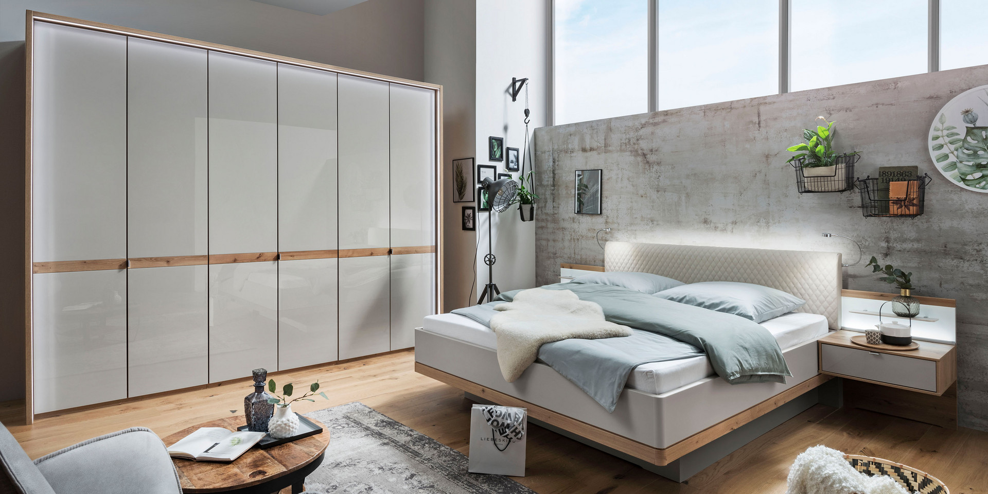 Toutes les façades d’armoires sont disponibles dans une coupe de champagne ou en combinaison avec un miroir en cristal. De plus, toutes les portes sont équipées d’une barre transversale de la couleur de la carcasse comme point culminant visuel. Pour un confort de fermeture optimal, vous pouvez obtenir sur demande différents amortisseurs pour votre armoire à portes coulissantes.