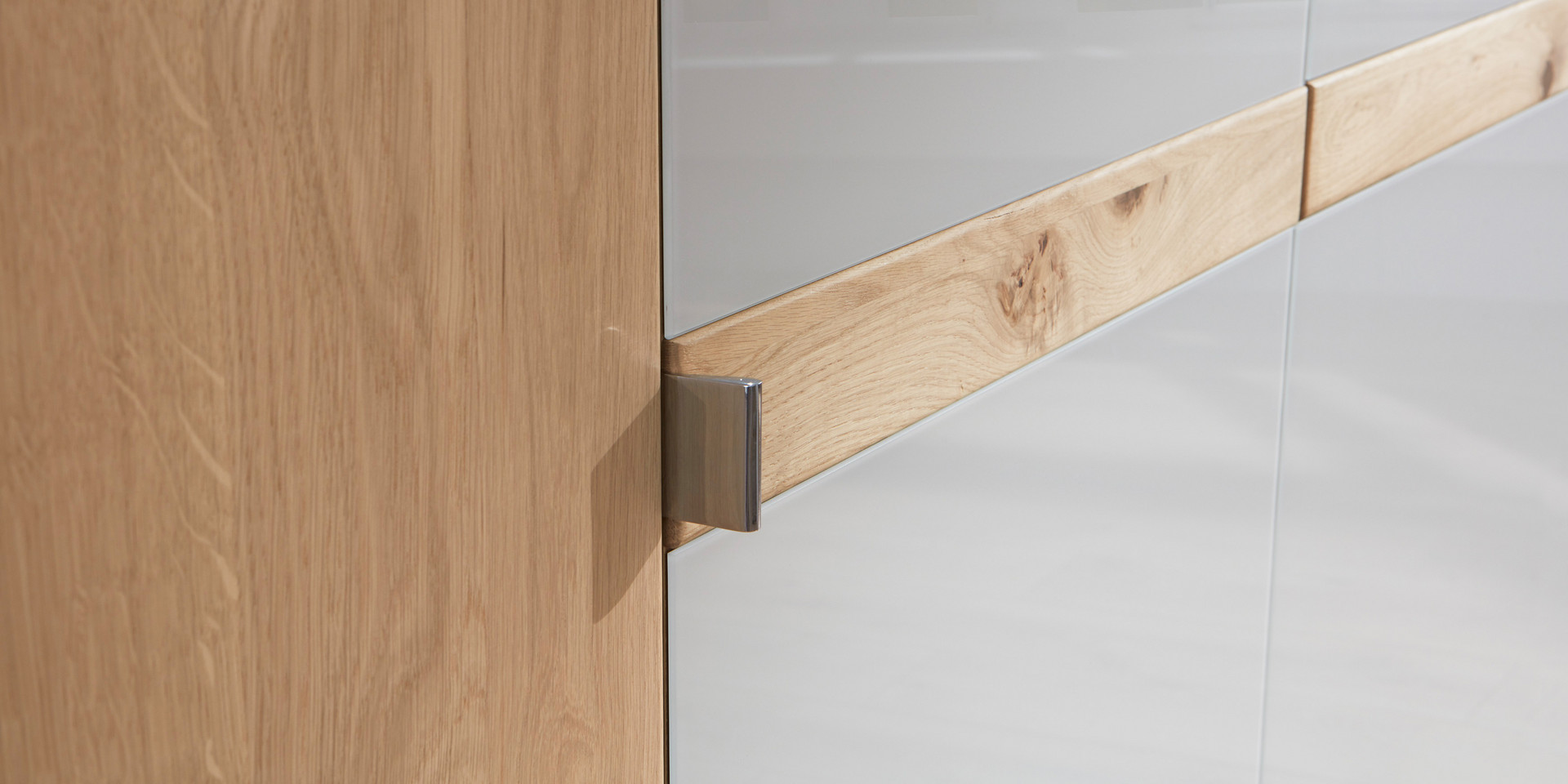 Convainquez-vous par nos armoires à portes coulissantes en cinq largeurs différentes et deux hauteurs avec une façade en verre champagne et une large barre transversale en chêne massif Bianco. Toutes les armoires peuvent être équipées d’un amortissement de porte intégré et peuvent être idéalement complétées à l’intérieur par des accessoires de garde-robe polyvalents tels que des étagères, des porte-pantalons, des inserts de tiroirs, des tringles à vêtements, des coulissants pour cravates et ceintures ainsi que des étagères à chaussures. Des cadres passe-partout ou des bandes de couronnes, au choix avec ou sans éclairage, complètent l’ensemble.