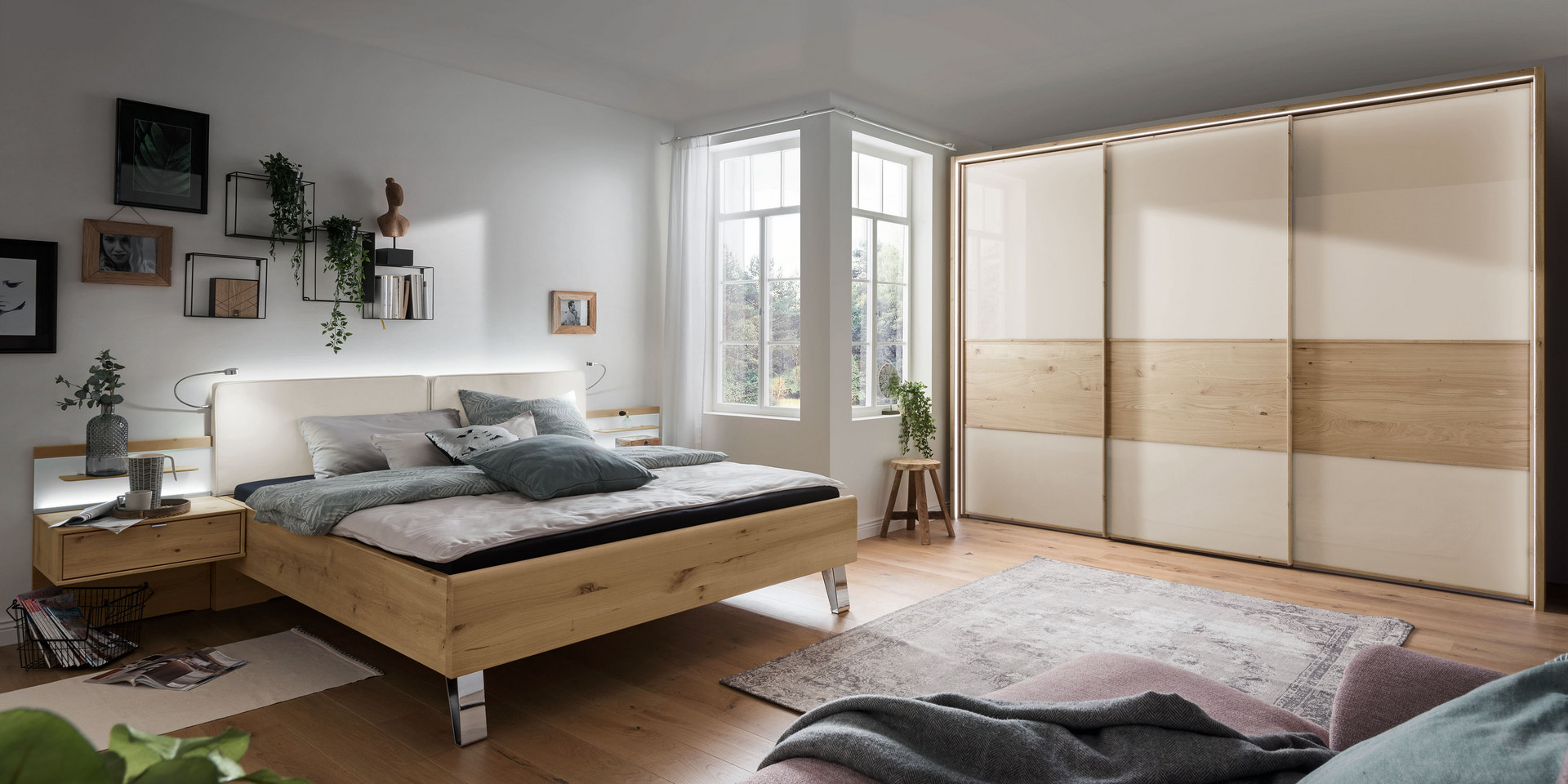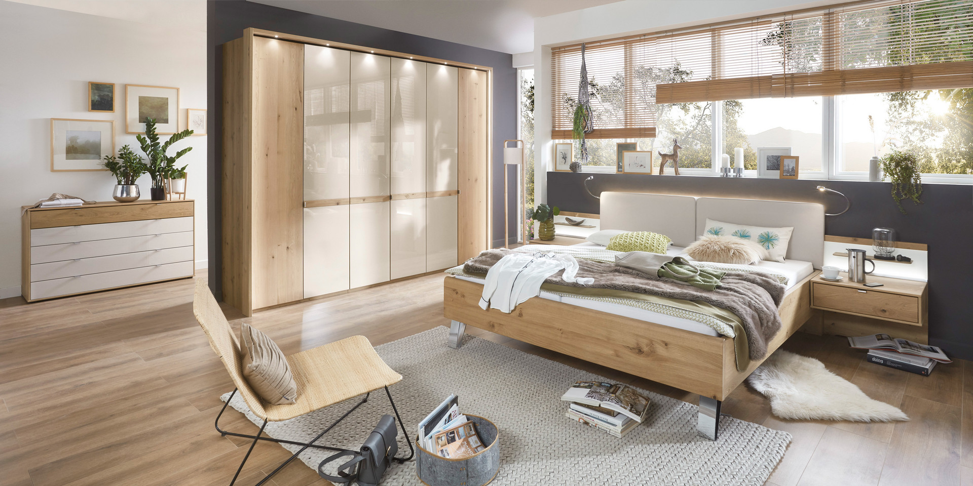 Avec BARI, vous obtenez un véritable accroche-regard dans votre chambre à coucher. La nouvelle essence de bois semi-massif Bianco Oak convainc par sa combinaison de verre et d’accents modernes de couleur ardoise ou chrome, que l’on retrouve dans les poignées, les poignées et les pieds de lit.