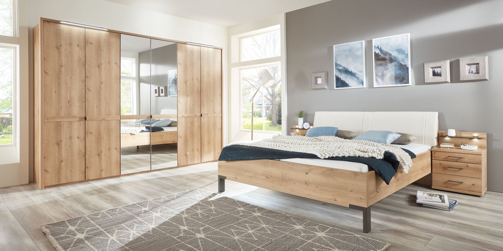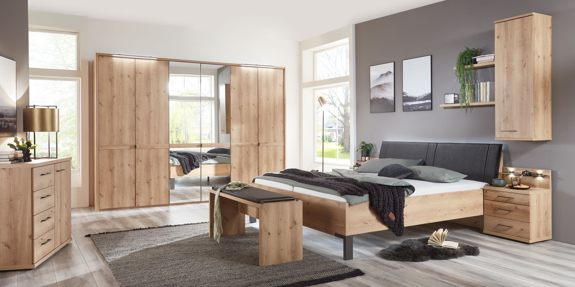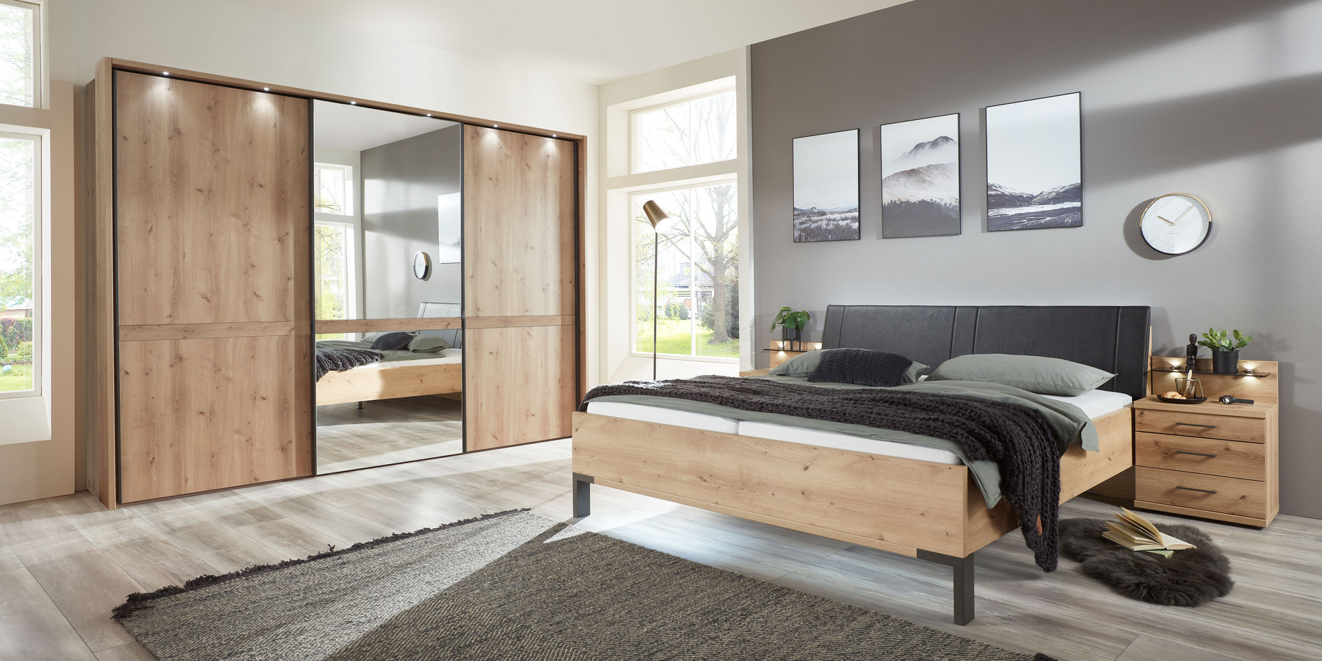 Installez-vous confortablement dans votre nouveau lit grâce à la gamme de meubles de chambre MEXICO. Ce modèle convainc par sa combinaison de caractère du bois et d’accents modernes de couleur ardoise, que l’on retrouve dans les baguettes, les poignées et les pieds de lit. Le design est simple et donc intemporel, de sorte que vous continuerez à profiter de la vue de votre chambre pendant de nombreuses années.
