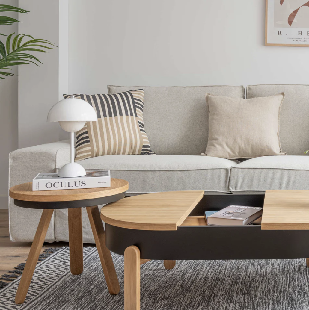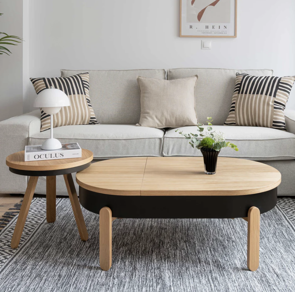 Combinez minimalisme et fonctionnalité avec notre table basse moderne avec un grand rangement et un plateau en chêne et noir.