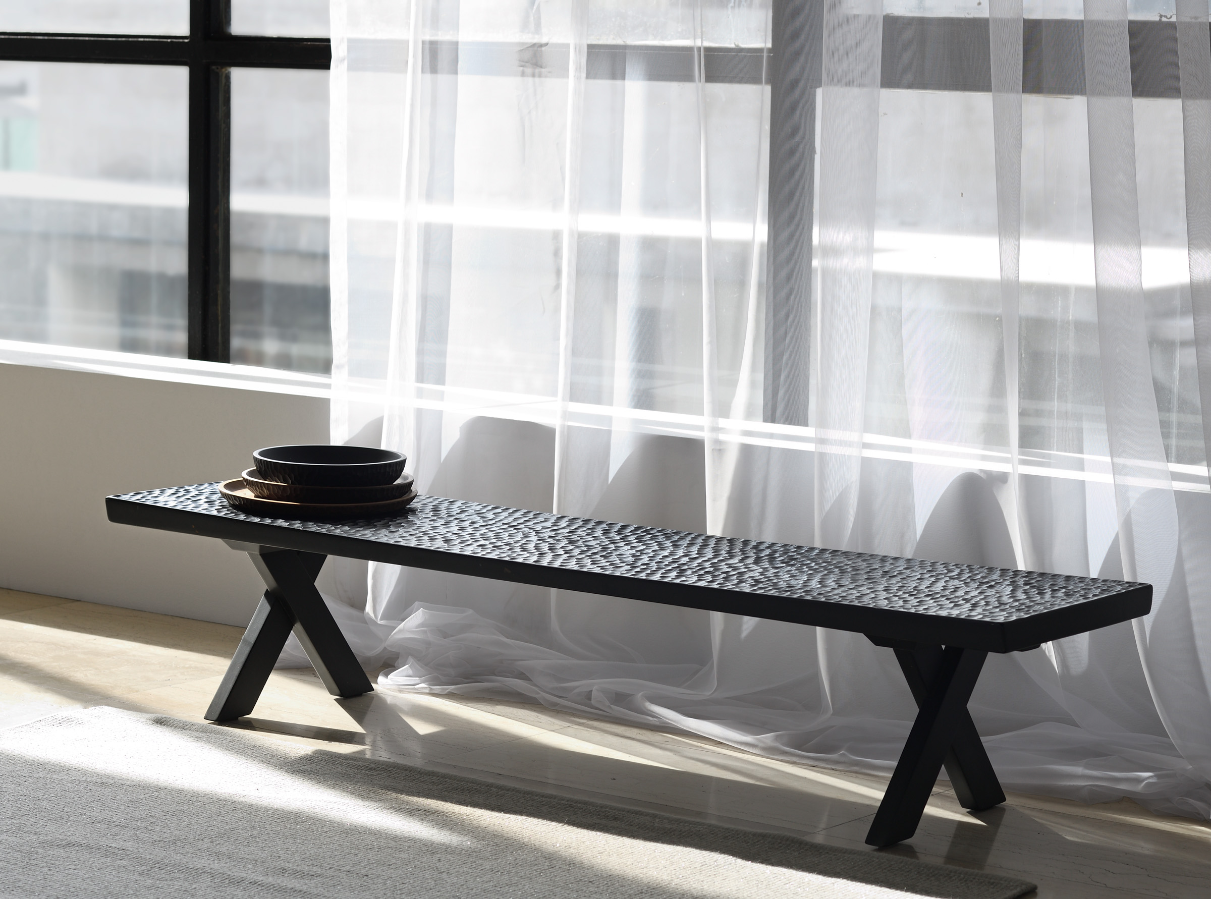 Toucher, c’est à la fois ressentir physiquement et émotionnellement. Touch est une collection de bancs et autres objets universels. Leur particularité réside dans les surfaces sculptées à la main qui stimulent notre instinct de ressentir quelque chose et reflètent notre soif d’environnements plus tactiles à l’ère numérique. Les sculptures sur les bancs nécessitent deux jours-homme pour être exécutées et – comme les artisans sculptent les pièces au hasard, sans dessin – chaque banc est unique car deux surfaces sculptées ne se ressembleront jamais. Le banc Touch est disponible avec des pieds en bois ou en bronze coulé.