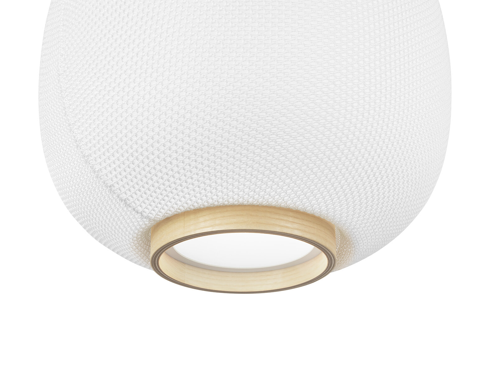 Base en métal peint. Abat-jour en tissu polyester tissé 3D Camira blanc, noir ou pétrole. Abat-jour intérieur en acrylique opale. Anneaux en bois de frêne. Câbles textiles. Autres couleurs de câbles sur demande.