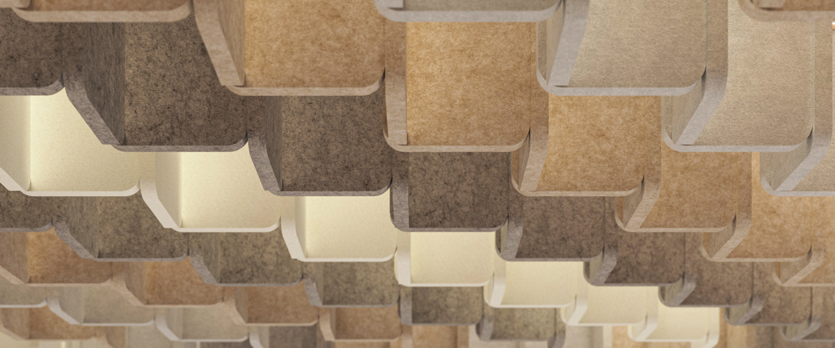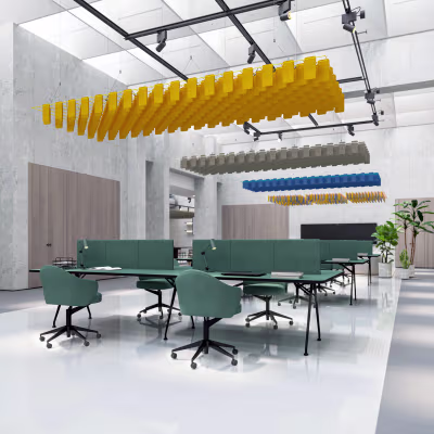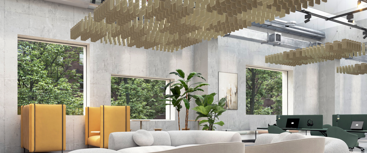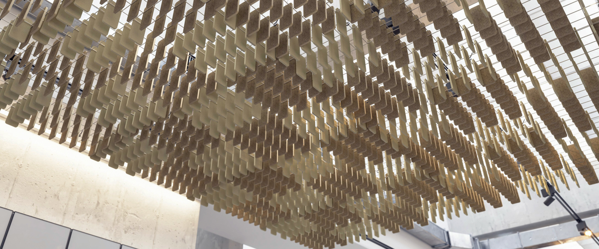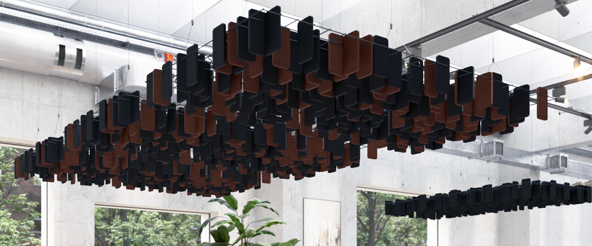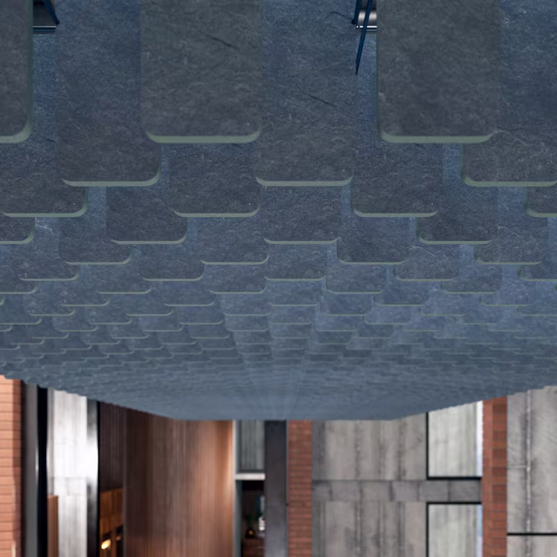 The Mesh Baffles hang from the ceiling using Y-Hook Cables, which efficiently distribute weight across the interconnected mesh, and minimise ceiling anchor points. These tactile marvels offer multi-directional coverage, enveloping sound from all angles and achieving an NRC values up to 1.0.