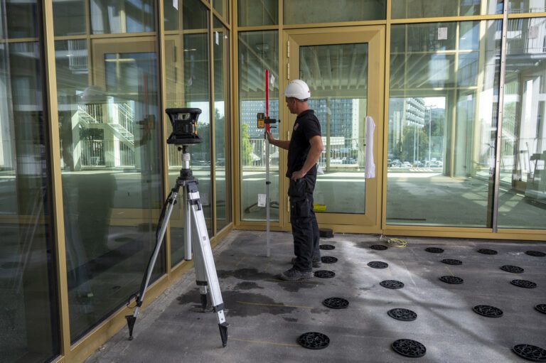 Pour obtenir la hauteur souhaitée, le tube DNS® est utilisé. Un laser de construction est utilisé pour déterminer la hauteur exacte de chaque tuyau. Celui-ci est coupé à la taille souhaitée et placé dans un pied/disque DNS®. Ceci est suivi d'un élément de support, en fonction du carreau à utiliser. Cela crée une surface de marche plane.